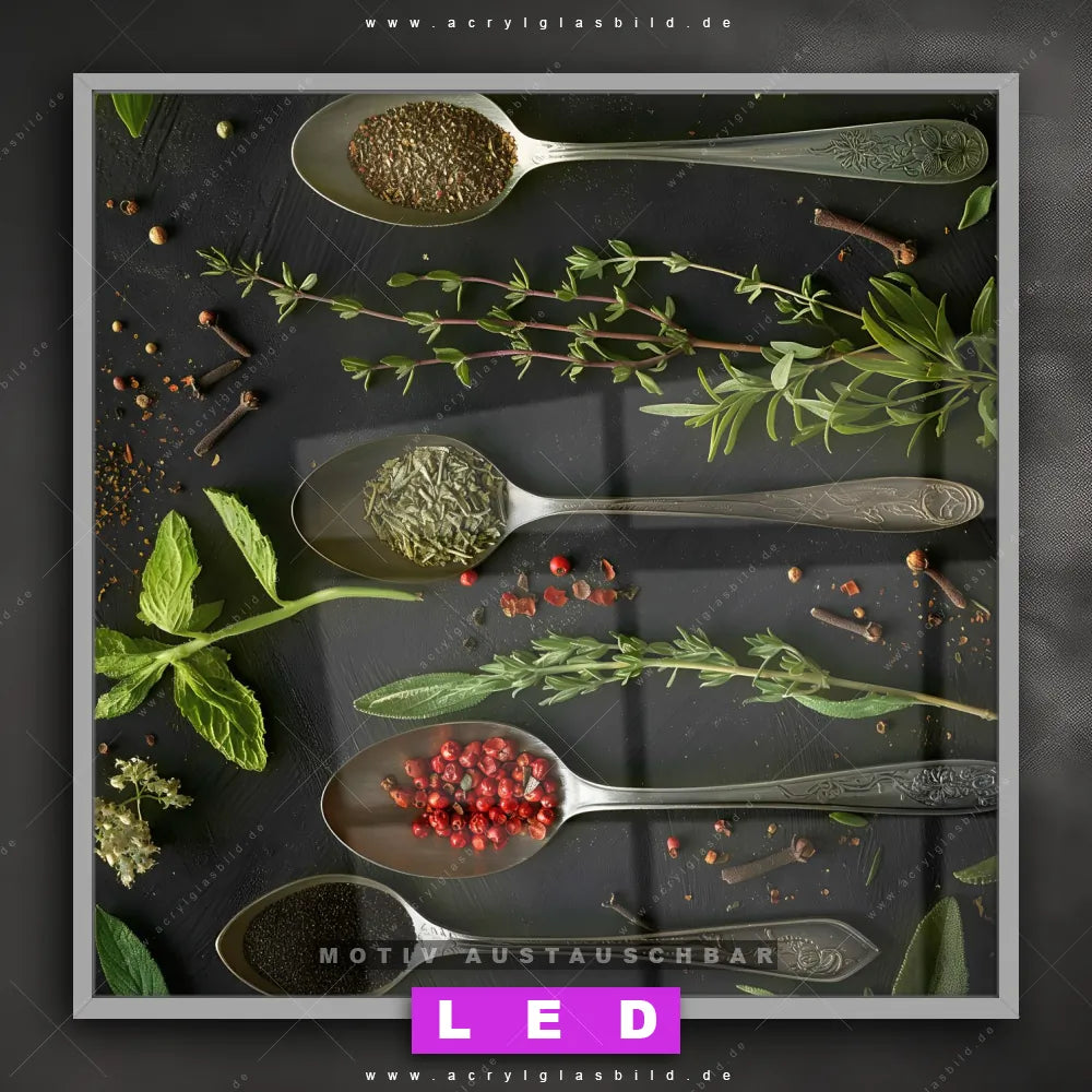 Vergiss dunkle Ecken und Langeweile! Mit unserem Acrylglasbild Löffel mit Gewürzen und seiner brillanten LED-Ausleuchtung wirst du dich nie wieder in der Dunkelheit verirren. Wenn du auf der Suche nach einem beleuchteten Wandbild aus Acrylglas mit Löffel, Besteck, Kräuter, Gewürze, kochen, Zutaten, Lebensmittel, Geschmack, Aromen bist, ist unser LED Acrylglasbild Canvalight® DIA Kulinarische Vielfalt auf Löffeln mit den strahlenden Motiv-Farben Silber, Schwarz, Grün genau das richtige Leuchtbild für dich. Das im Natürlich - Realistisch Stil gestaltete LED Bild mit glänzender Front aus Acrylglas passt perfekt zu jedem Einrichtungsstil in Bar - Gastronomie, Küche - Esszimmer – vom minimalistischen Chic bis zum kreativen Chaos.