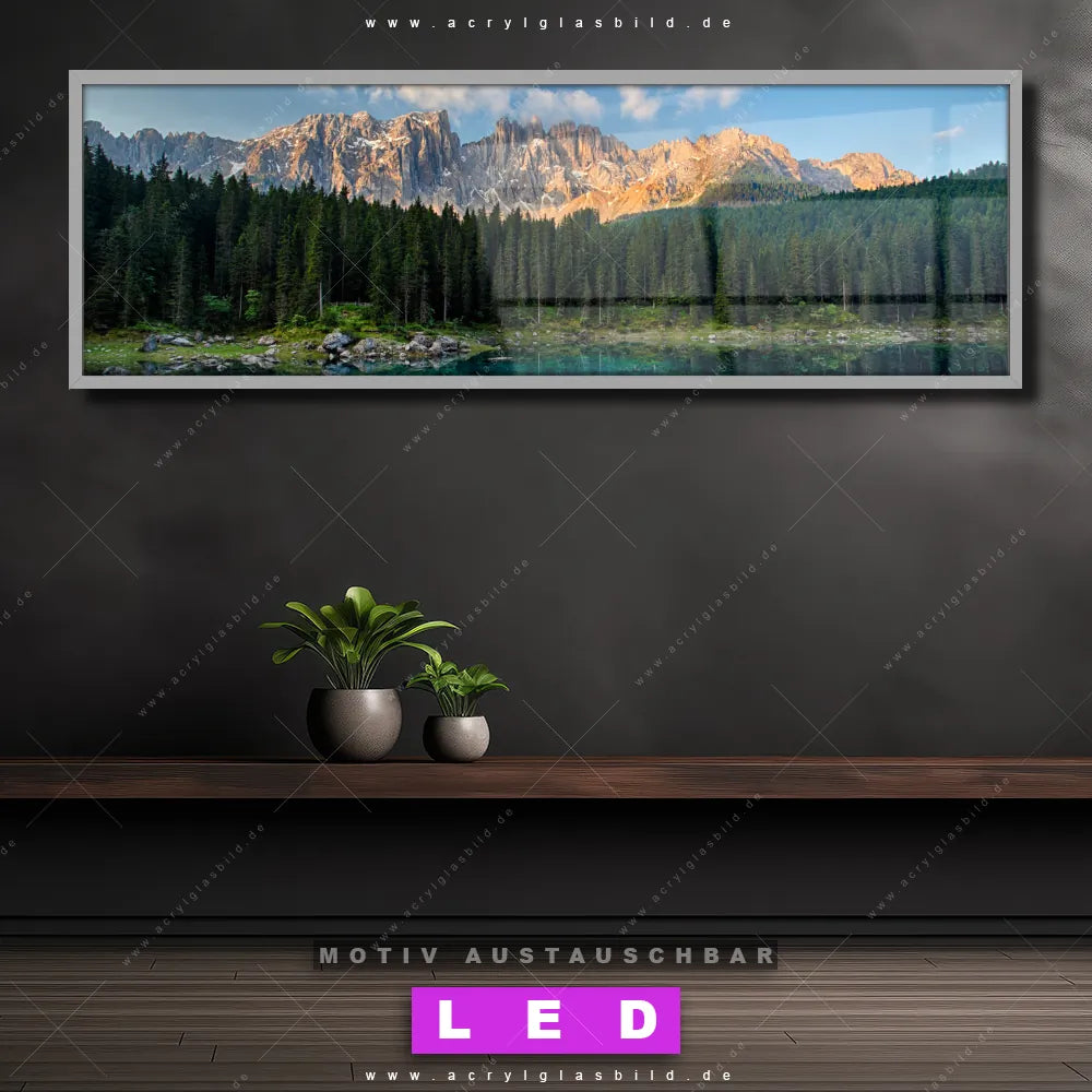 Deine Wände könnten dringend ein dimmbares LED Bild mit Fernbedienung und optionaler Farbtemperatursteuerung gebrauchen? Dann haben wir das perfekte Wandbild mit LED Beleuchtung für dich: unser mega-cooles Landschaften Canvalight® DIA LED Acrylglasbild! Mit unserem angesagten Leuchtbild aus Acrylglas im Panorama-Format und der austauschbaren bedruckten Acrylglas-Scheibe Bergsee im Wald bringst du nicht nur Licht, sondern auch jede Menge Flair in deine Räume.