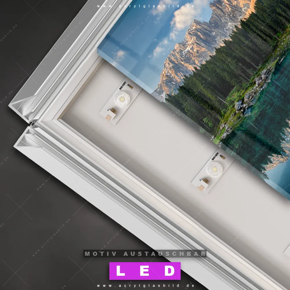 Also, worauf wartest du noch? Gib mit einem beleuchteten Wandbild mit wechselbarer Acrylglas-Scheibe deinen Wänden das gewisse Etwas und bestelle jetzt das LED Acrylglasbild Canvalight® DIA Bergwald am See – dein Zuhause wird es dir danken und deine Freunde werden dank der wechselbaren Motive erblassen!