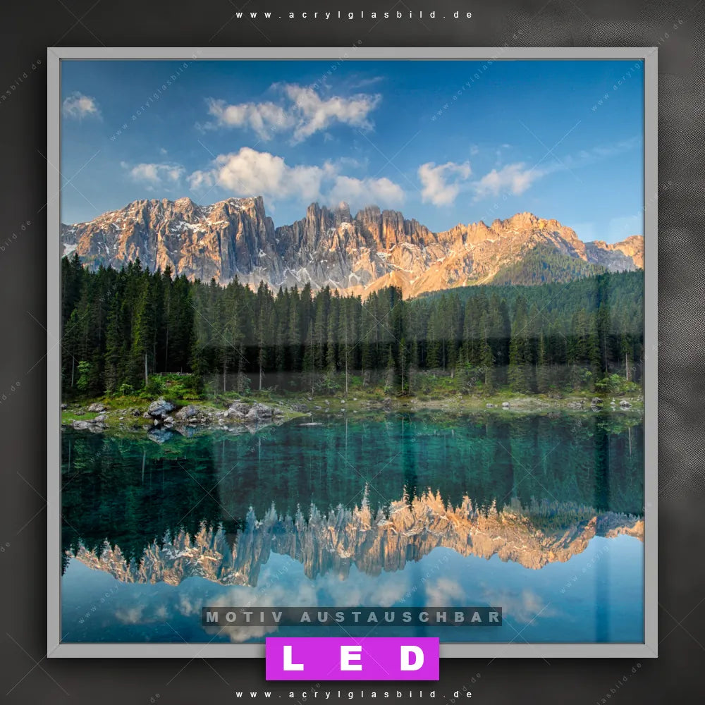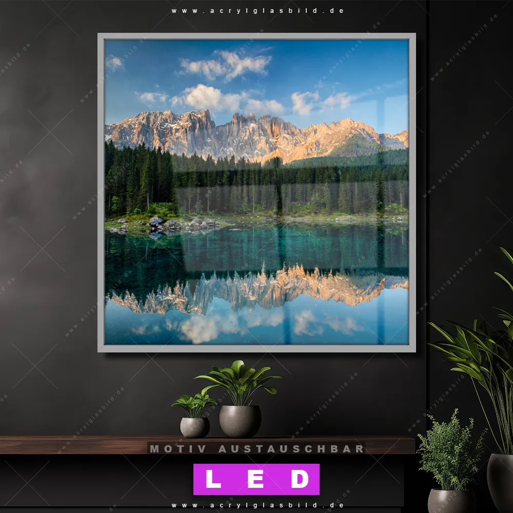 Bist du bereit, deine Wände mit einem dimmbaren LED Bild mit Fernbedienung und optionaler Farbtemperatursteuerung zum Leuchten zu bringen? Wir haben das ultimative Landschaften LED Acrylglasbild Canvalight® DIA für dich! Unser LED Wandbild aus Acrylglas Bergsee im Wald im Quadratischen Format mit austauschbarer bedruckter Acrylglas-Scheibe im DIA-Klapprahmen bringt sofort jede Menge Glanz in deine vier Wände.