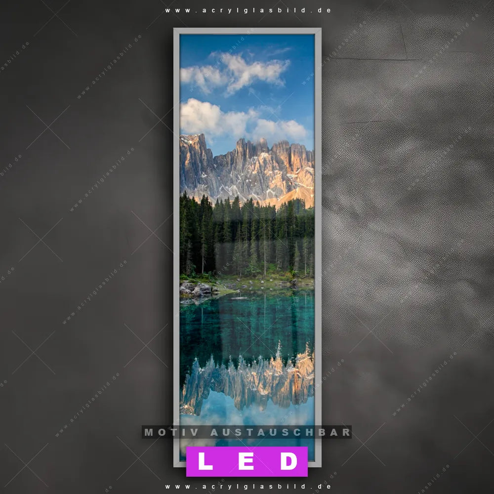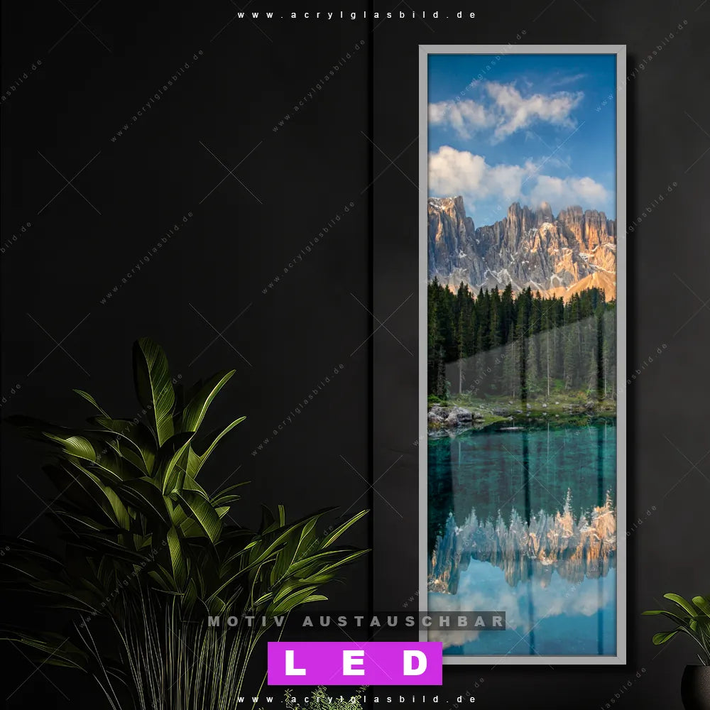 Bist du bereit, deine Wände mit einem dimmbaren LED Bild mit Fernbedienung und optionaler Farbtemperatursteuerung auf das nächste Level zu bringen? Unser Landschaften Canvalight® DIA LED Acrylglasbild ist genau das, was du brauchst! Das Wandbild mit LED Beleuchtung im Schmalen Format mit austauschbarer bedruckter Acrylglas-Scheibe Bergsee im Wald bringt Licht und Stil in dein Zuhause – und das in null Komma nichts!