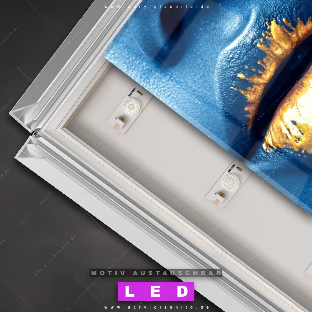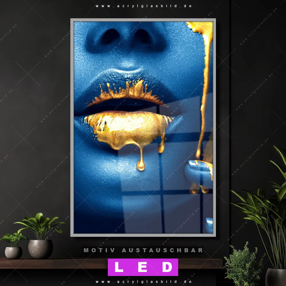 Wer braucht schon langweilige Wände, wenn man sie mit unserem LED Acrylglasbild Canvalight® DIA Verführung in Blau-Gold aufpeppen kann? Dank der genialen LED-Ausleuchtung wirst du in Bar - Gastronomie, Friseur - Beauty, Wohnzimmer - Schlafzimmer nie wieder über deine eigenen Füße stolpern. Wenn du nach einem beleuchteten Wandbild aus Acrylglas mit Frau, Lippen, Mund, Farbe, Beauty suchst, dann ist unser LED Acrylglasbild Goldtropfen im Gesicht in den hammermäßigen Motiv-Farben Gold, Blau genau das richtige LED Bild für dich. Im coolen Modern Art Stil gestaltet, passt das LED Leuchtbild mit DIA-Klapprahmen und glänzender Front aus Acrylglas perfekt zu jedem Einrichtungsstil – sogar zu deinem chaotischen Kreativlabor!