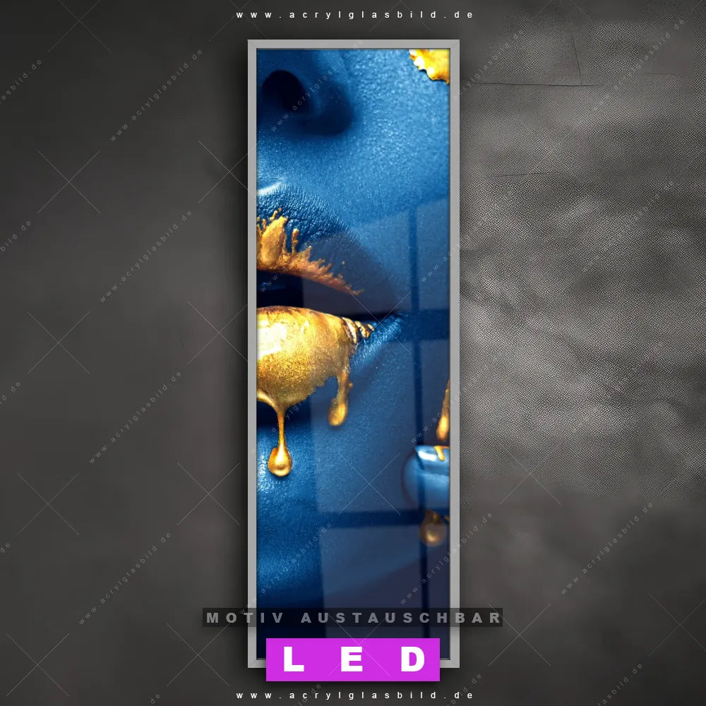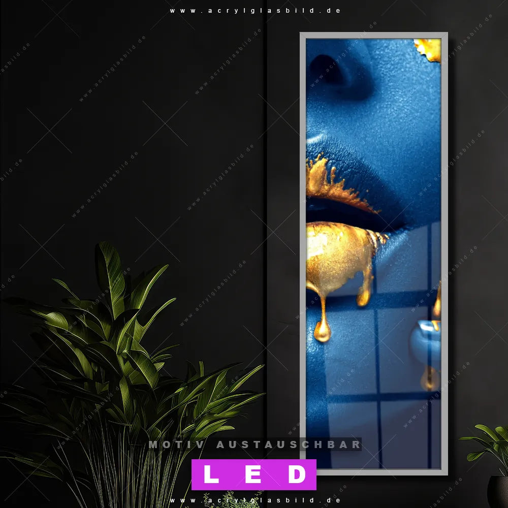 Vergiss dunkle Ecken und langweilige Wände in Bar - Gastronomie, Friseur - Beauty, Wohnzimmer - Schlafzimmer! Mit unserem LED Acrylglasbild Canvalight® DIA Verführung in Blau-Gold wirst du nie wieder im Dunkeln tappen. Suchst du nach einem beleuchteten Wandbild mit Frau, Lippen, Mund, Farbe, Beauty? Dann ist unser Leuchtbild Goldtropfen im Gesicht mit den strahlenden Motiv-Farben Gold, Blau genau das richtige LED Bild für dich. Egal, ob dein Stil minimalistisch oder exotisch ist, dieses LED Leuchtbild im Modern Art Stil mit DIA-Klapprahmen und glänzender Front aus Acrylglas passt perfekt zu jeder Einrichtung.