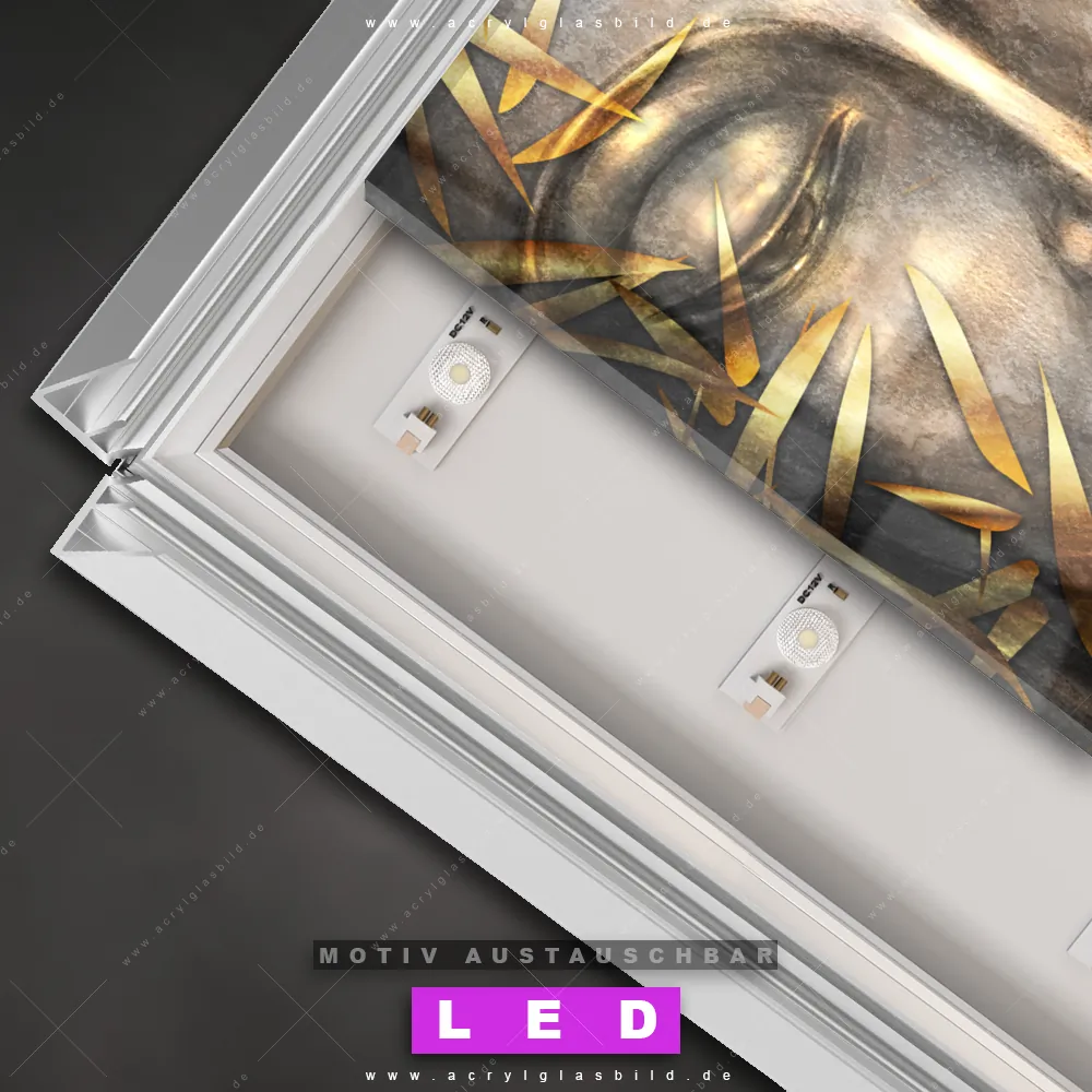 Also, worauf wartest du noch? Gib mit einem beleuchteten Wandbild mit wechselbarer Acrylglas-Scheibe deinen Wänden das gewisse Etwas und bestelle jetzt das LED Acrylglasbild Canvalight® DIA Buddha-Kopf in Gold-Silber – dein Zuhause wird es dir danken und deine Freunde werden dank der wechselbaren Motive erblassen!