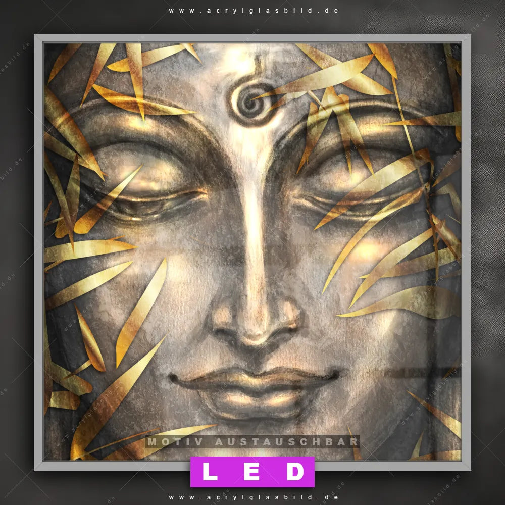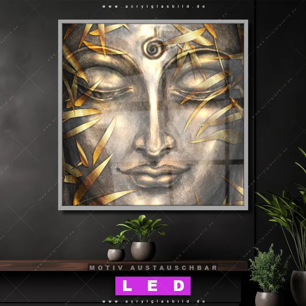 Bist du bereit, deine Wände mit einem dimmbaren LED Bild mit Fernbedienung und optionaler Farbtemperatursteuerung zum Leuchten zu bringen? Wir haben das ultimative Buddha - Feng Shui LED Acrylglasbild Canvalight® DIA für dich! Unser LED Wandbild aus Acrylglas Buddha Silber & Gold im Quadratischen Format mit austauschbarer bedruckter Acrylglas-Scheibe im DIA-Klapprahmen bringt sofort jede Menge Glanz in deine vier Wände.