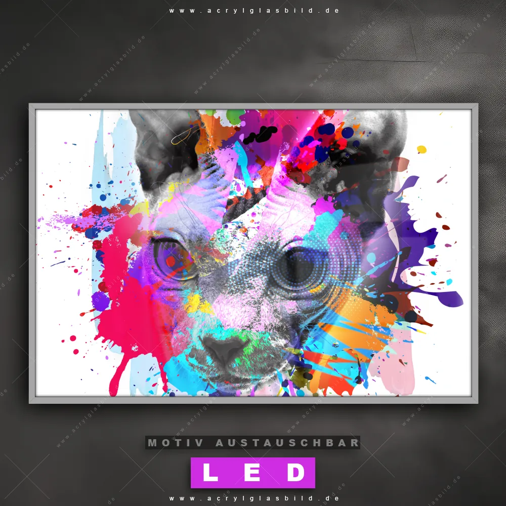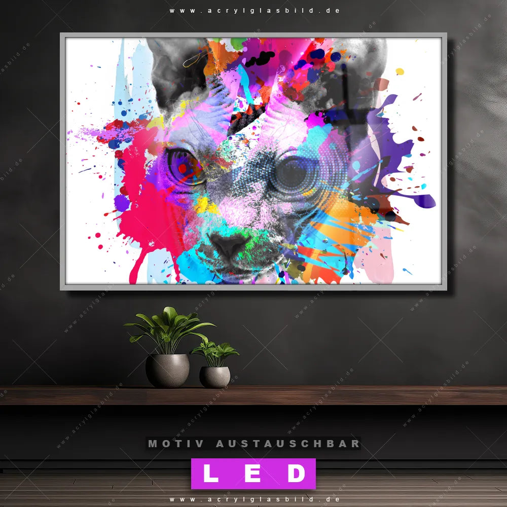 Mit unserem LED Acrylglasbild Canvalight® DIA Sphynx-Katze abstrakt und seiner genialen LED-Ausleuchtung wirst du nie wieder im Dunkeln auf deinem Sofa herumtappen. Wenn du nach einem beleuchteten Wandbild aus Acrylglas mit Katze, Ägypten, Splash, Farbspritzer für Bar - Gastronomie, Wohnzimmer - Schlafzimmer suchst, ist unser LED Leuchtbild Kopf Sphynx-Katze in bunt in den beeindruckenden Motiv-Farben Bunt genau das richtige beleuchtete Wandbild für dich. Gestaltet im Abstrakt, Grunge, Mixed Media, Modern Art, Pop Art, Street Art Stil, passt dieses LED Wandbild mit DIA-Klapprahmen und glänzender Front aus Acrylglas perfekt zu jedem Einrichtungsstil – sogar zu deinem chaotischen kreativen Durcheinander!
