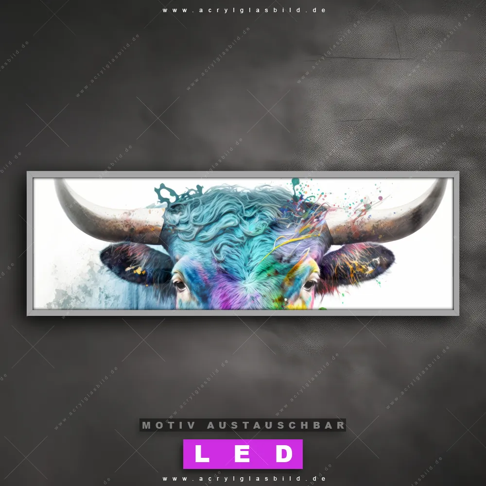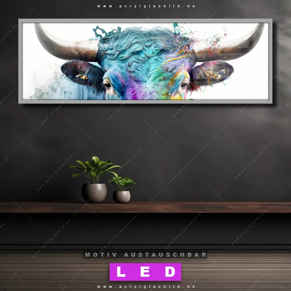 Deine Wände könnten dringend ein dimmbares LED Bild mit Fernbedienung und optionaler Farbtemperatursteuerung gebrauchen? Dann haben wir das perfekte Wandbild mit LED Beleuchtung für dich: unser mega-cooles Tierwelt Canvalight® DIA LED Acrylglasbild! Mit unserem angesagten Leuchtbild aus Acrylglas im Panorama-Format und der austauschbaren bedruckten Acrylglas-Scheibe Bunter Stierkopf bringst du nicht nur Licht, sondern auch jede Menge Flair in deine Räume.