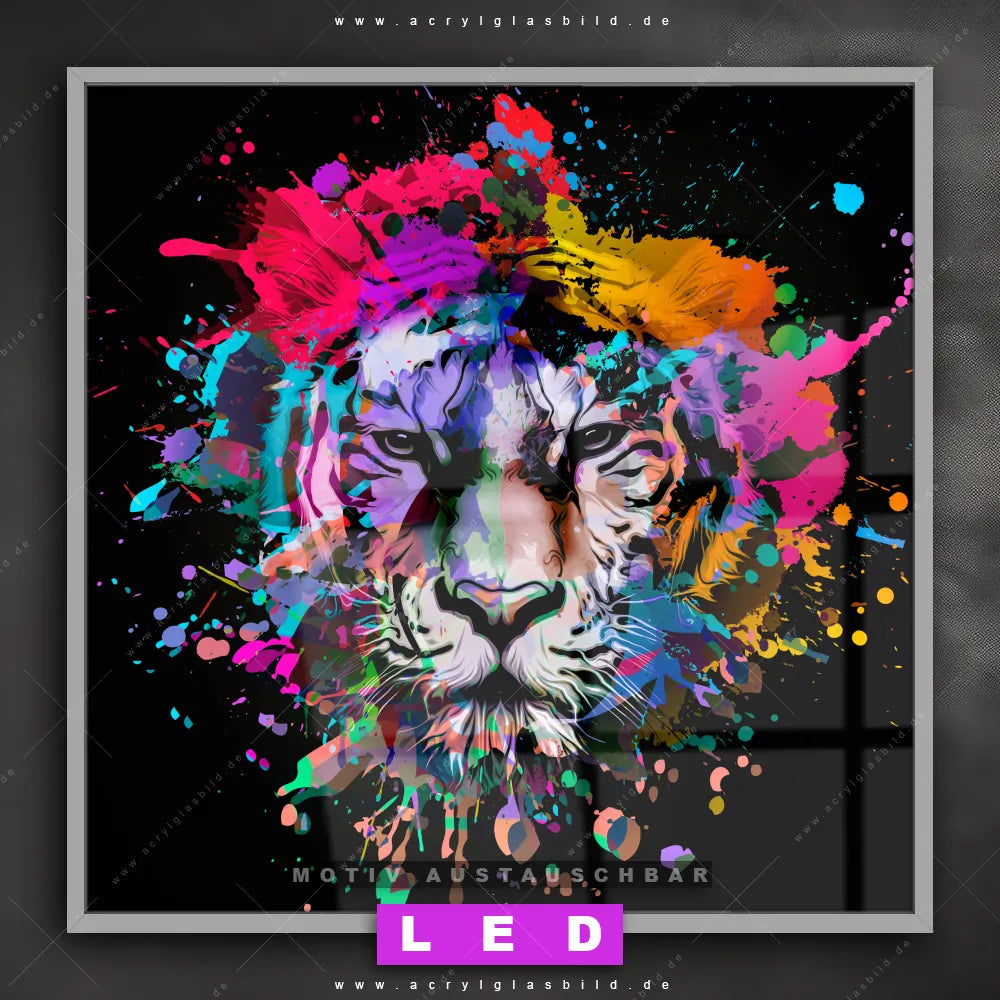 Begriffe wie Raubkatze, Tiger, Afrika, Dschungel, Splash, Farbspritzer, Farbexplosion, Farbe, Porträt haben dich auf der Suche nach deinem neuen LED Wandbild aus Acrylglas inspiriert? Dann sollte das LED Acrylglasbild Tiger in Farbvielfalt den Weg zu dir finden.