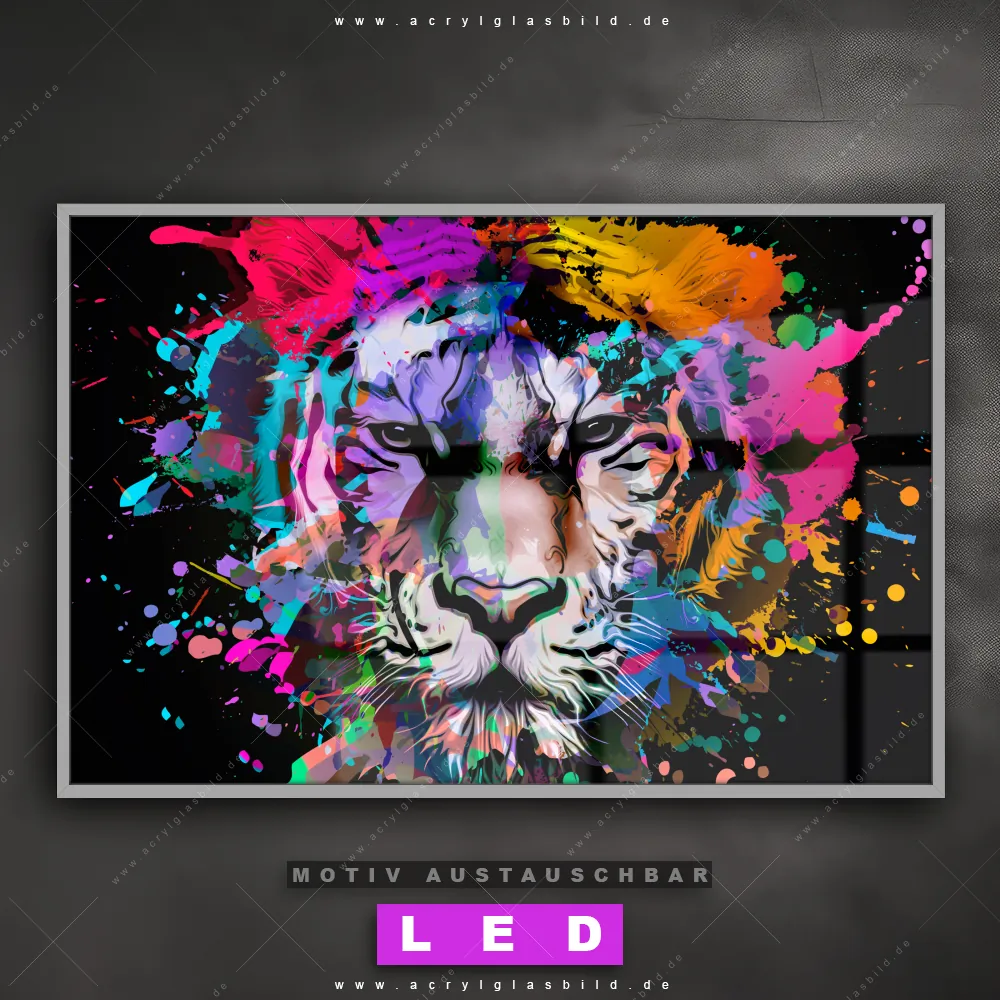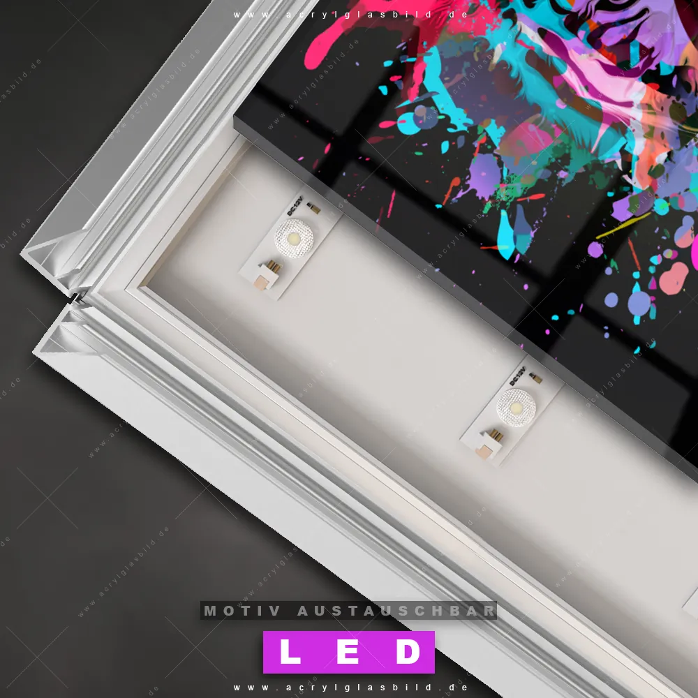 Du bist auf der Suche nach einem dimmbaren Tierwelt LED Bild mit Fernbedienung und optionaler Farbtemperatursteuerung? Dann haben wir hier genau das richtige Wandbild mit LED Beleuchtung für dich: Unser Canvalight® DIA LED Acrylglasbild Bunter Tiger Schwarz im Querformat mit austauschbarer bedruckter Acrylglas-Scheibe. Dieses Leuchtbild bringt sofort Partybeleuchtung in deine Räume!