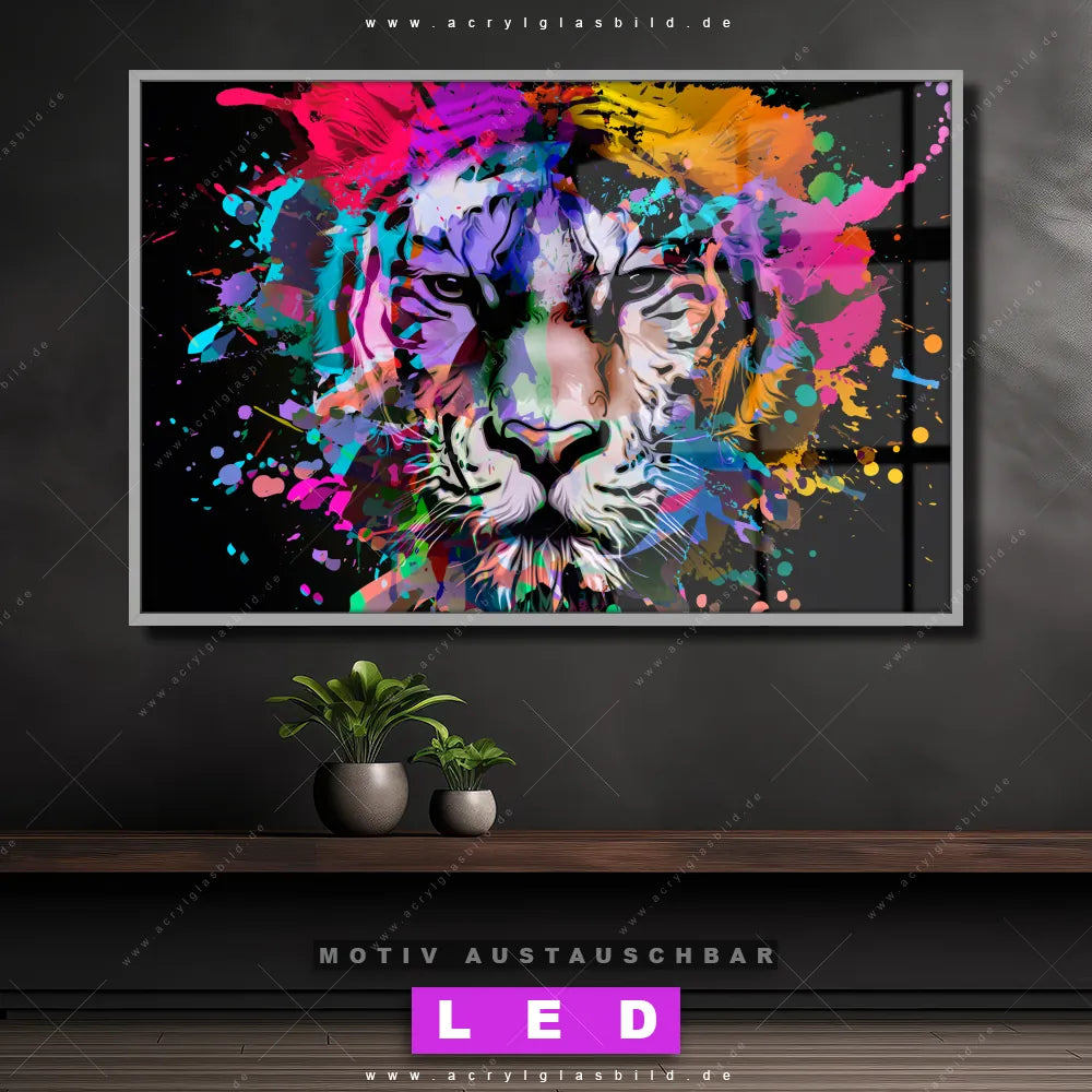 Mit unserem LED Acrylglasbild Canvalight® DIA Tiger in Farbvielfalt und seiner genialen LED-Ausleuchtung wirst du nie wieder im Dunkeln auf deinem Sofa herumtappen. Wenn du nach einem beleuchteten Wandbild aus Acrylglas mit Raubkatze, Tiger, Afrika, Dschungel, Splash, Farbspritzer, Farbexplosion, Farbe, Porträt für Bar - Gastronomie, Wohnzimmer - Schlafzimmer suchst, ist unser LED Leuchtbild Tiger mit Farbakzenten in den beeindruckenden Motiv-Farben Bunt, Schwarz genau das richtige beleuchtete Wandbild für dich. Gestaltet im Abstrakt, Modern Art, Pop Art, Street Art Stil, passt dieses LED Wandbild mit DIA-Klapprahmen und glänzender Front aus Acrylglas perfekt zu jedem Einrichtungsstil – sogar zu deinem chaotischen kreativen Durcheinander!