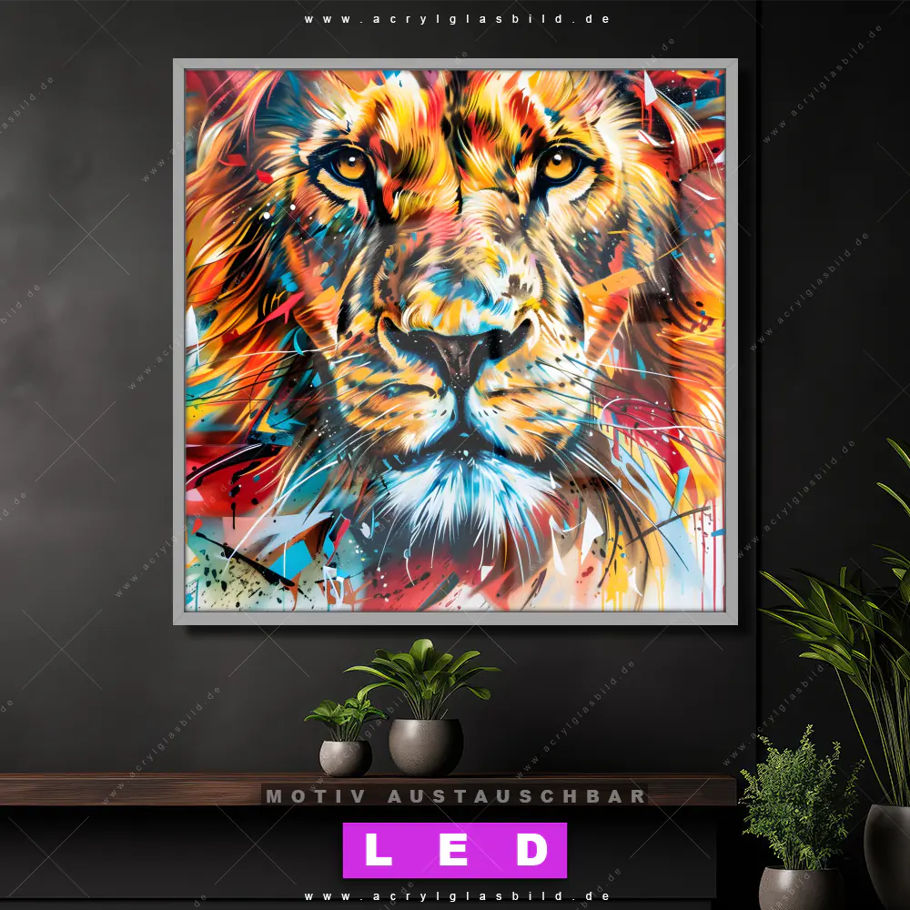 Bist du bereit, deine Wände mit einem dimmbaren LED Bild mit Fernbedienung und optionaler Farbtemperatursteuerung zum Leuchten zu bringen? Wir haben das ultimative Tierwelt LED Acrylglasbild Canvalight® DIA für dich! Unser LED Wandbild aus Acrylglas Der Löwe - Urban Style im Quadratischen Format mit austauschbarer bedruckter Acrylglas-Scheibe im DIA-Klapprahmen bringt sofort jede Menge Glanz in deine vier Wände.