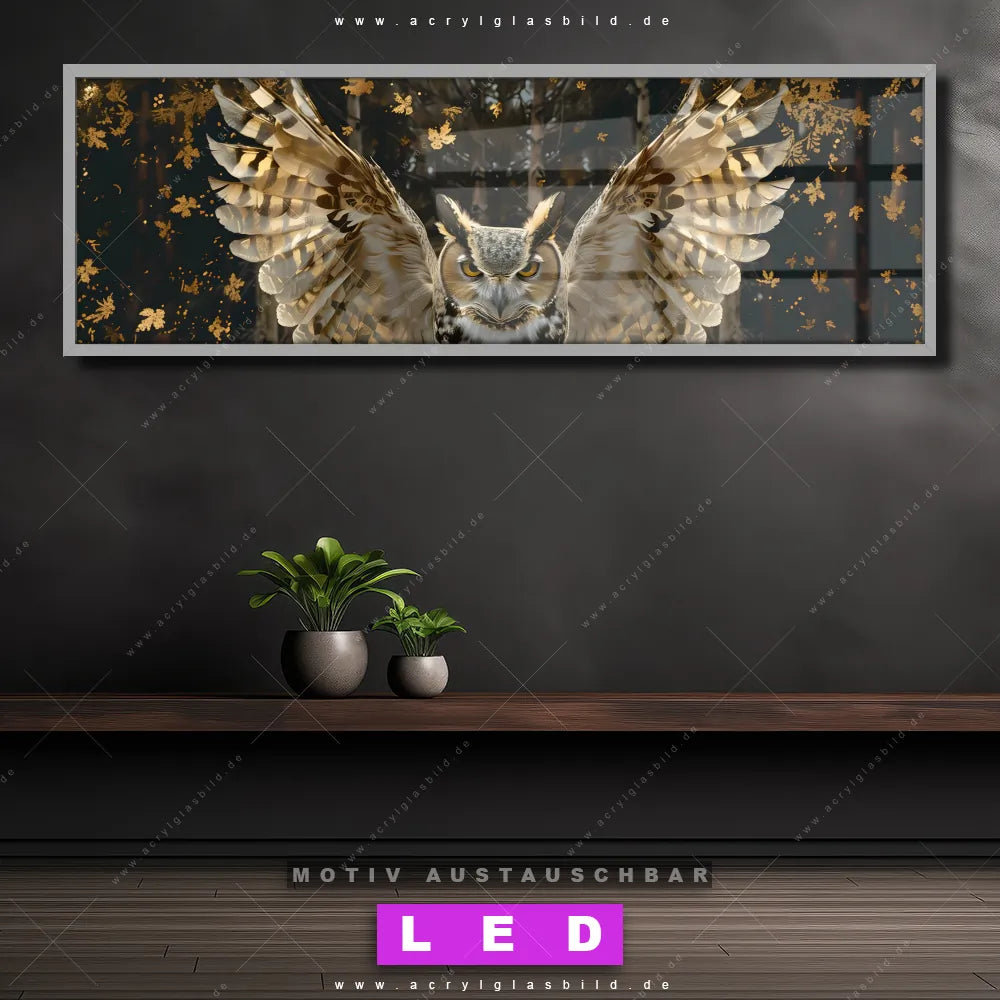 LED Acrylglasbild Canvalight® DIA | Eule inmitten goldener Blätter | Panorama