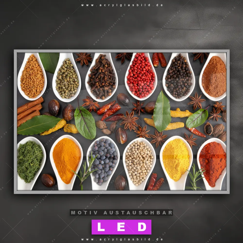 Mit unserem LED Acrylglasbild Canvalight® DIA Löffel mit bunten Gewürzen und seiner genialen LED-Ausleuchtung wirst du nie wieder im Dunkeln auf deinem Sofa herumtappen. Wenn du nach einem beleuchteten Wandbild aus Acrylglas mit Gewürze, Kräuter, Löffel, Besteck, Lebensmittel, Geschmack, Indien für Bar - Gastronomie, Küche - Esszimmer suchst, ist unser LED Leuchtbild Farbenfrohe Gewürze & Kräuter in den beeindruckenden Motiv-Farben Bunt, Weiss, Blau, Braun, Beige, Gelb , Grün, Lila, Ocker, Orange, Rot, Rosa genau das richtige beleuchtete Wandbild für dich. Gestaltet im Natürlich - Realistisch Stil, passt dieses LED Wandbild mit DIA-Klapprahmen und glänzender Front aus Acrylglas perfekt zu jedem Einrichtungsstil – sogar zu deinem chaotischen kreativen Durcheinander!