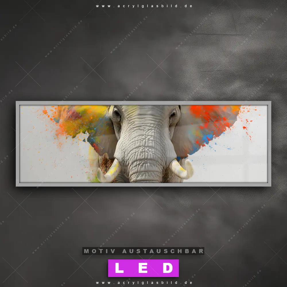 LED Acrylglasbild Canvalight® DIA | Farbenexplosion mit Elefant | Panorama