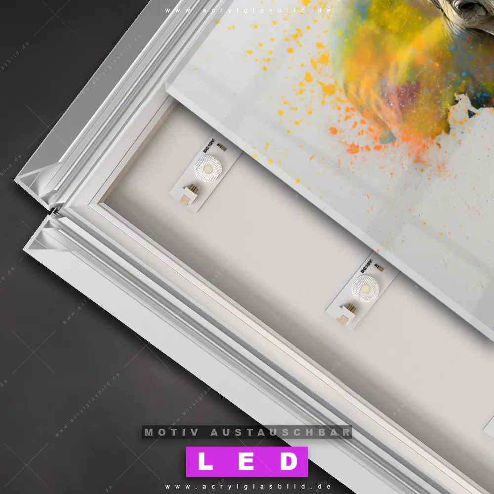 Du bist auf der Suche nach einem dimmbaren Tierwelt LED Bild mit Fernbedienung und optionaler Farbtemperatursteuerung? Dann haben wir hier genau das richtige Wandbild mit LED Beleuchtung für dich: Unser Canvalight® DIA LED Acrylglasbild Farbenexplosion mit Elefant im Querformat mit austauschbarer bedruckter Acrylglas-Scheibe. Dieses Leuchtbild bringt sofort Partybeleuchtung in deine Räume!