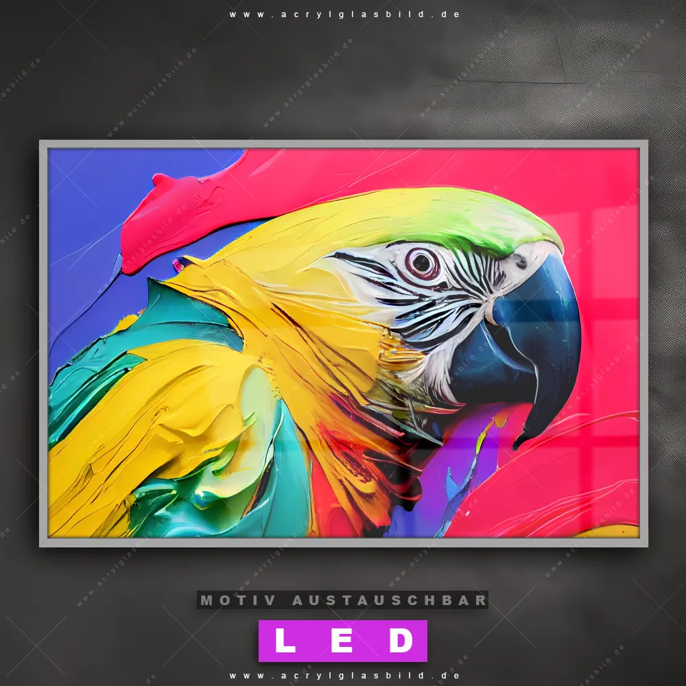 Du bist auf der Suche nach einem dimmbaren Tierwelt LED Bild mit Fernbedienung und optionaler Farbtemperatursteuerung? Dann haben wir hier genau das richtige Wandbild mit LED Beleuchtung für dich: Unser Canvalight® DIA LED Acrylglasbild Federn Papagei im Querformat mit austauschbarer bedruckter Acrylglas-Scheibe. Dieses Leuchtbild bringt sofort Partybeleuchtung in deine Räume!