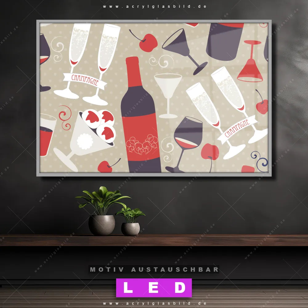 Begriffe wie Küche, Wein, Gläser, genießen, Alkohol, Rotwein, Flaschen, modern, Cocktailkirsche, Sekt, Martinigläser, Obst haben dich auf der Suche nach deinem neuen LED Wandbild aus Acrylglas inspiriert? Dann sollte das LED Acrylglasbild Weinflaschen und Champagner den Weg zu dir finden.