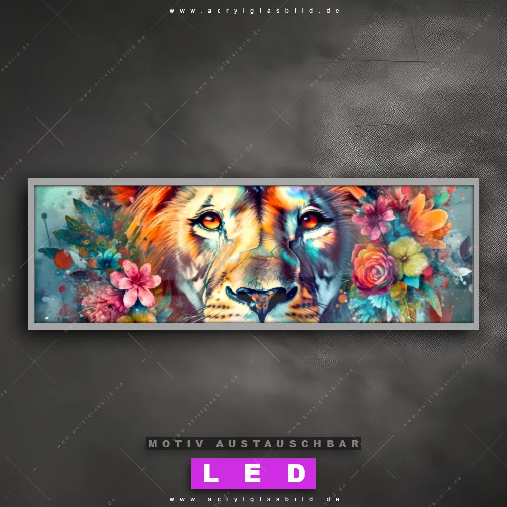 Deine Wände könnten dringend ein dimmbares LED Bild mit Fernbedienung und optionaler Farbtemperatursteuerung gebrauchen? Dann haben wir das perfekte Wandbild mit LED Beleuchtung für dich: unser mega-cooles Tierwelt, Blumen - Botanik Canvalight® DIA LED Acrylglasbild! Mit unserem angesagten Leuchtbild aus Acrylglas im Panorama-Format und der austauschbaren bedruckten Acrylglas-Scheibe Floraler Löwe bringst du nicht nur Licht, sondern auch jede Menge Flair in deine Räume.