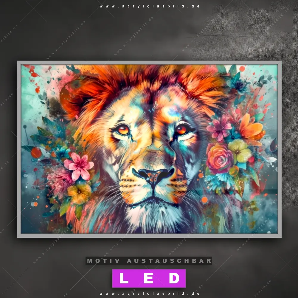 Du bist auf der Suche nach einem dimmbaren Tierwelt, Blumen - Botanik LED Bild mit Fernbedienung und optionaler Farbtemperatursteuerung? Dann haben wir hier genau das richtige Wandbild mit LED Beleuchtung für dich: Unser Canvalight® DIA LED Acrylglasbild Floraler Löwe im Querformat mit austauschbarer bedruckter Acrylglas-Scheibe. Dieses Leuchtbild bringt sofort Partybeleuchtung in deine Räume!