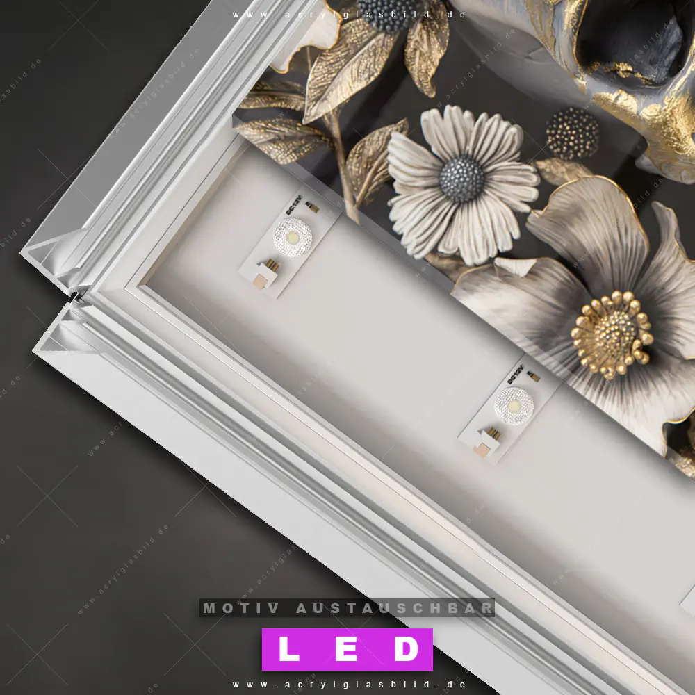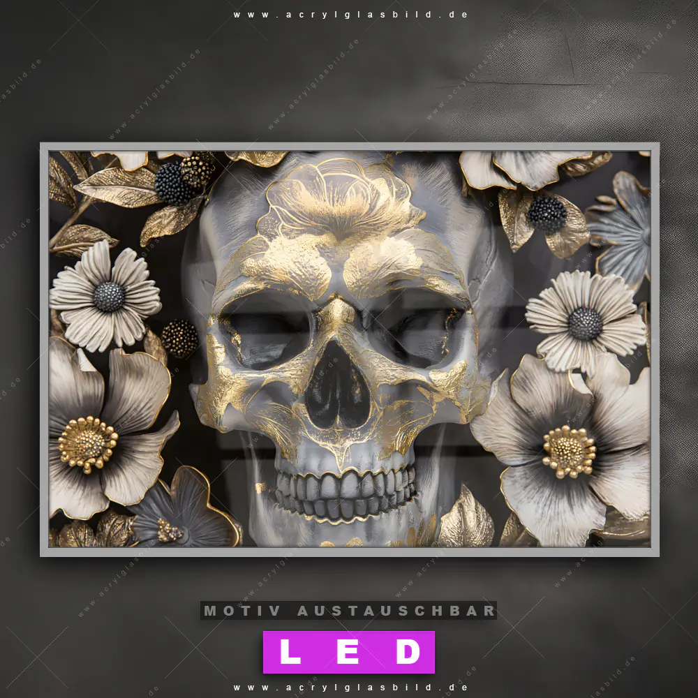 Du bist auf der Suche nach einem dimmbaren Porträts - Menschen, Blumen - Botanik LED Bild mit Fernbedienung und optionaler Farbtemperatursteuerung? Dann haben wir hier genau das richtige Wandbild mit LED Beleuchtung für dich: Unser Canvalight® DIA LED Acrylglasbild Floraler Totenschädel im Querformat mit austauschbarer bedruckter Acrylglas-Scheibe. Dieses Leuchtbild bringt sofort Partybeleuchtung in deine Räume!