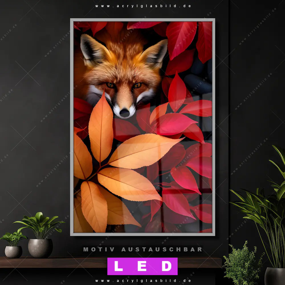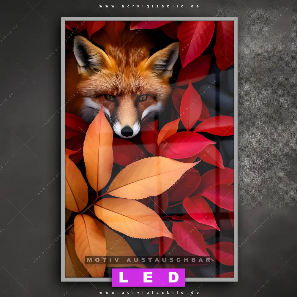 Begriffe wie Fuchs, Natur, Rotfuchs, Tier, Tierporträt, Nahaufnahme, Blätter, Laub, Herbst haben dich auf der Suche nach deinem neuen LED Wandbild aus Acrylglas inspiriert? Dann sollte das LED Acrylglasbild Fuchs mit bunten Blättern den Weg zu dir finden.