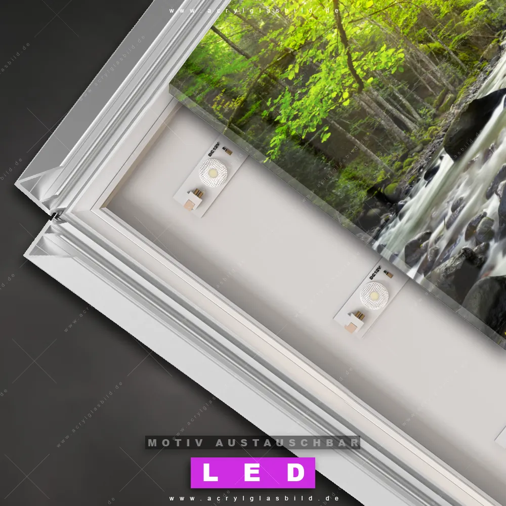 Also, worauf wartest du noch? Gib mit einem beleuchteten Wandbild mit wechselbarer Acrylglas-Scheibe deinen Wänden das gewisse Etwas und bestelle jetzt das LED Acrylglasbild Canvalight® DIA Fluss mit fließendem Wasser – dein Zuhause wird es dir danken und deine Freunde werden dank der wechselbaren Motive erblassen!