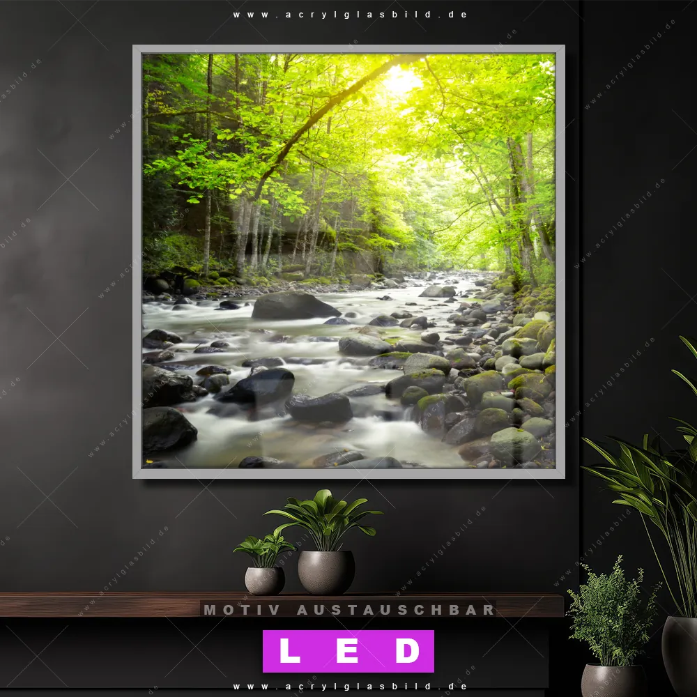 Bist du bereit, deine Wände mit einem dimmbaren LED Bild mit Fernbedienung und optionaler Farbtemperatursteuerung zum Leuchten zu bringen? Wir haben das ultimative Landschaften, Wald - Bäume LED Acrylglasbild Canvalight® DIA für dich! Unser LED Wandbild aus Acrylglas Gebirgsfluss im Wald im Quadratischen Format mit austauschbarer bedruckter Acrylglas-Scheibe im DIA-Klapprahmen bringt sofort jede Menge Glanz in deine vier Wände.