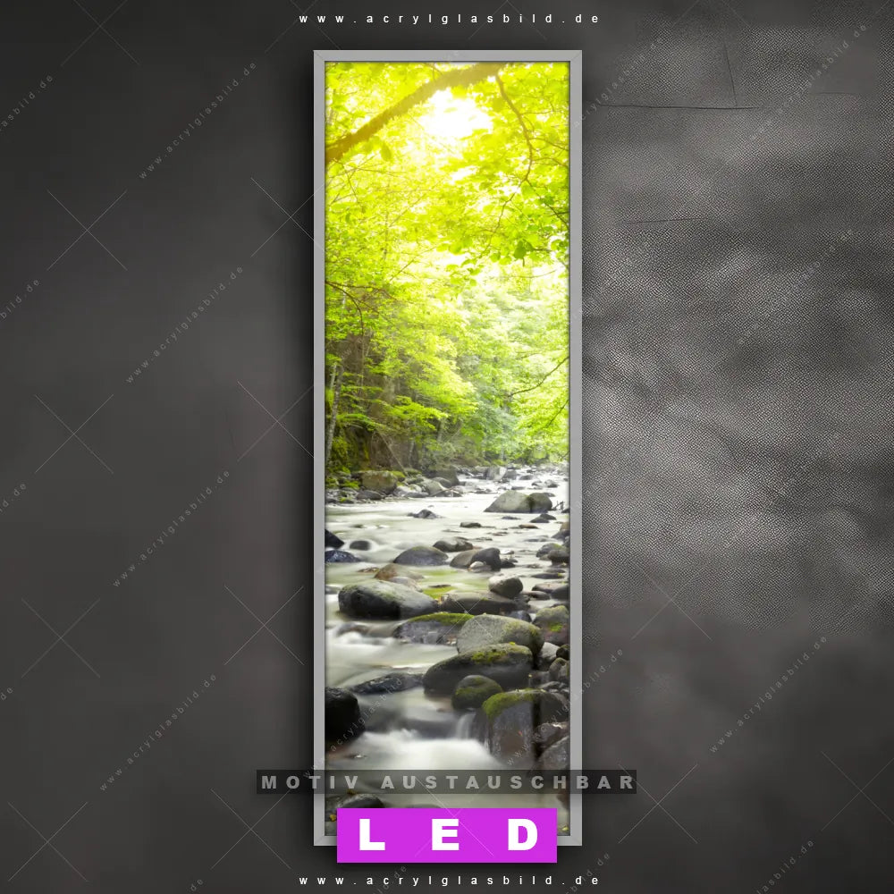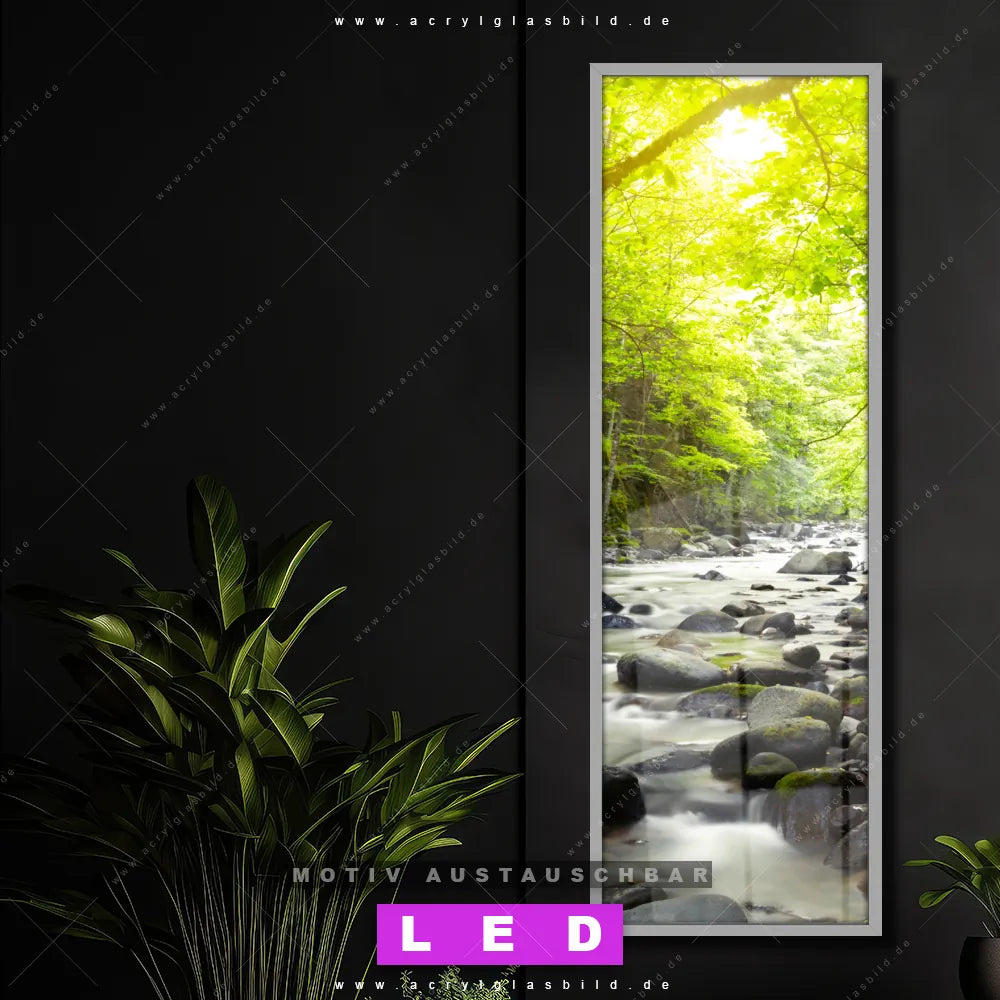 Bist du bereit, deine Wände mit einem dimmbaren LED Bild mit Fernbedienung und optionaler Farbtemperatursteuerung auf das nächste Level zu bringen? Unser Landschaften, Wald - Bäume Canvalight® DIA LED Acrylglasbild ist genau das, was du brauchst! Das Wandbild mit LED Beleuchtung im Schmalen Format mit austauschbarer bedruckter Acrylglas-Scheibe Gebirgsfluss im Wald bringt Licht und Stil in dein Zuhause – und das in null Komma nichts!