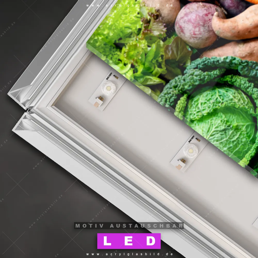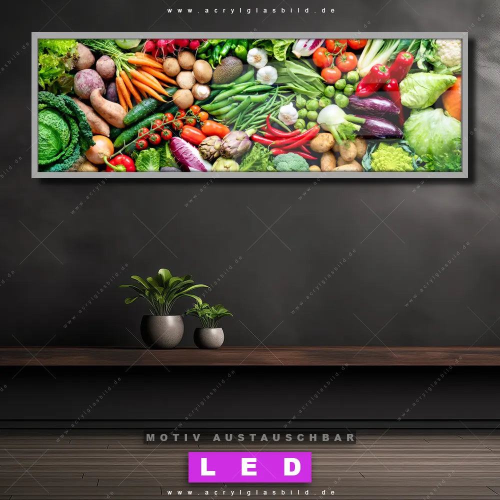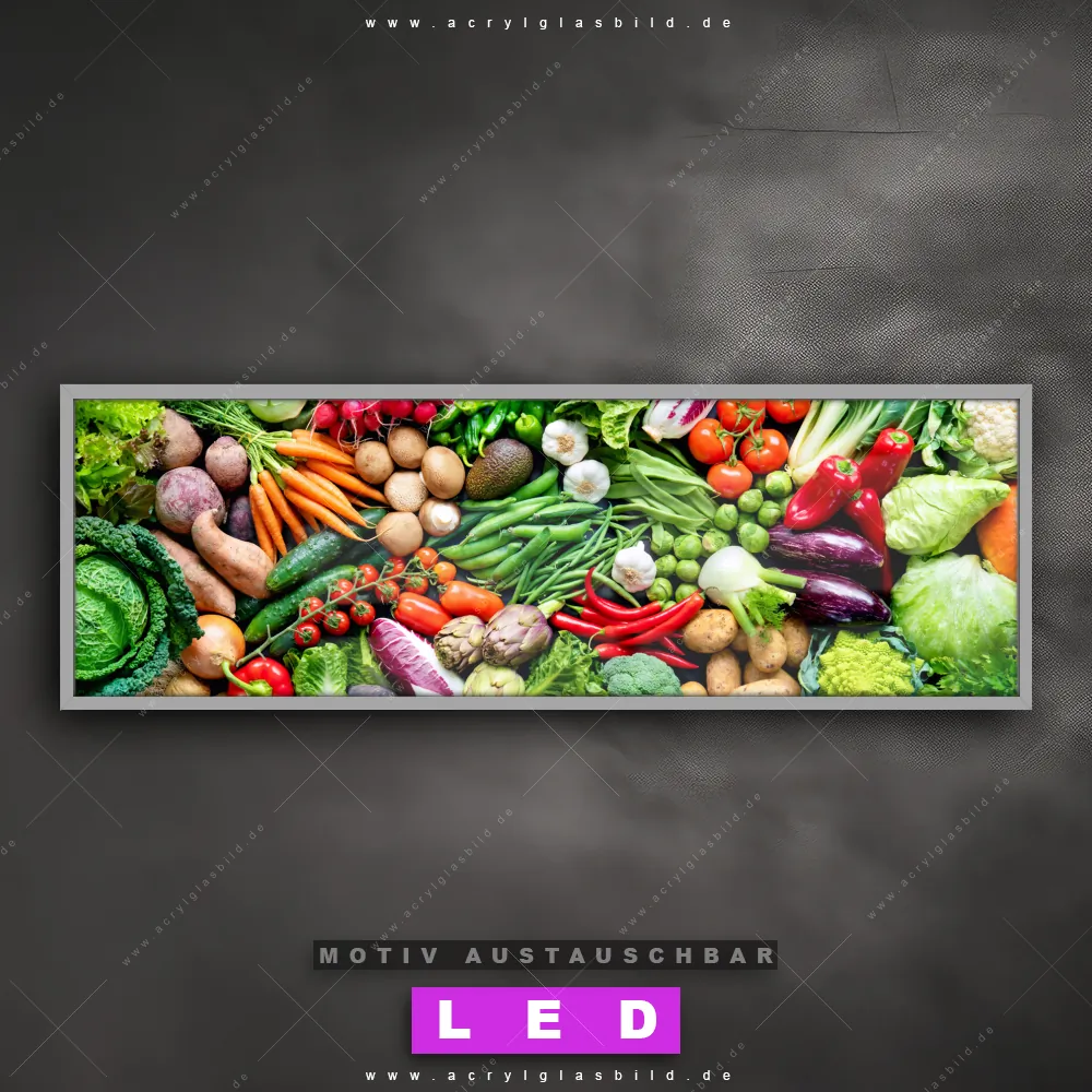 Deine Wände könnten dringend ein dimmbares LED Bild mit Fernbedienung und optionaler Farbtemperatursteuerung gebrauchen? Dann haben wir das perfekte Wandbild mit LED Beleuchtung für dich: unser mega-cooles Essen - Trinken Canvalight® DIA LED Acrylglasbild! Mit unserem angesagten Leuchtbild aus Acrylglas im Panorama-Format und der austauschbaren bedruckten Acrylglas-Scheibe Gesundes Gemüse bringst du nicht nur Licht, sondern auch jede Menge Flair in deine Räume.