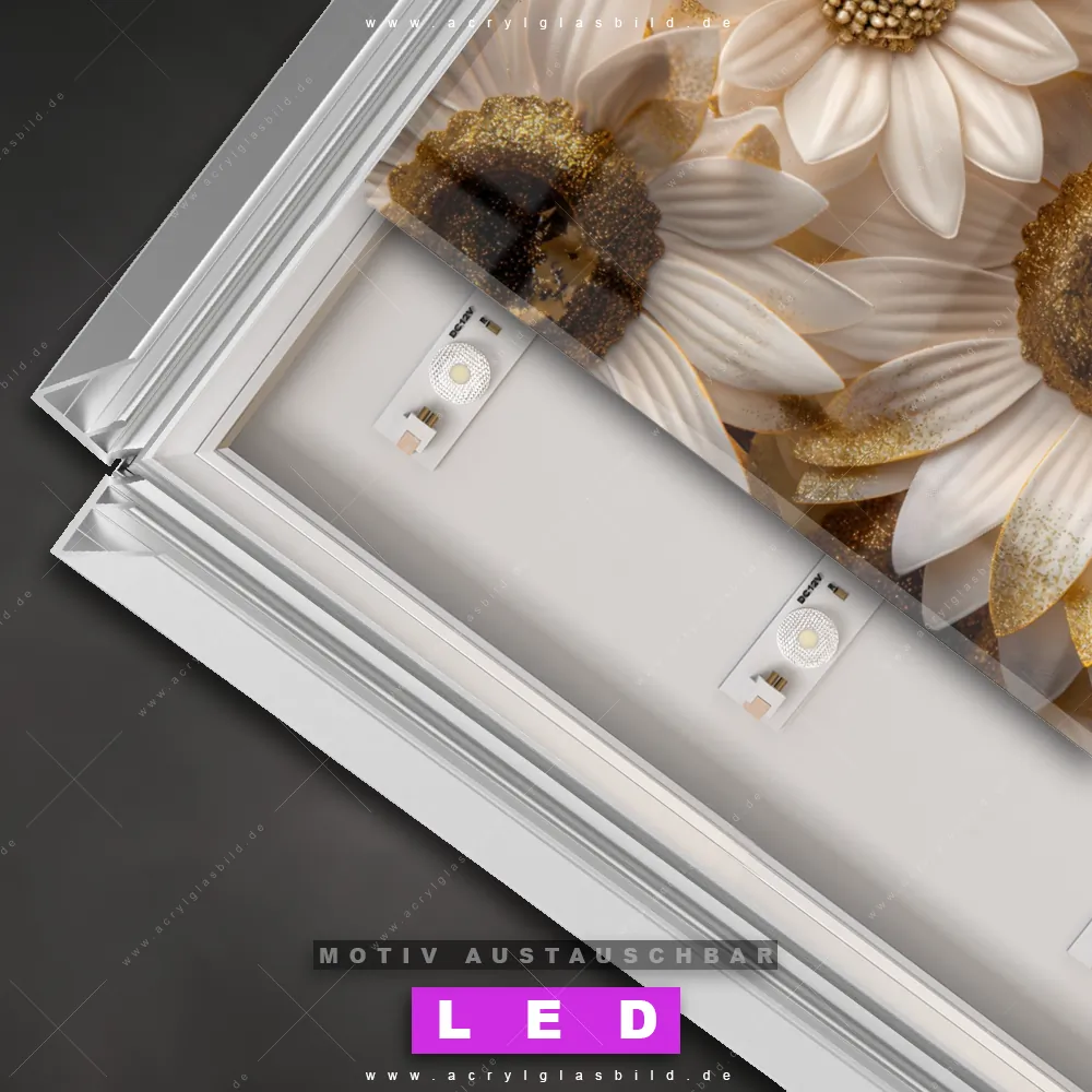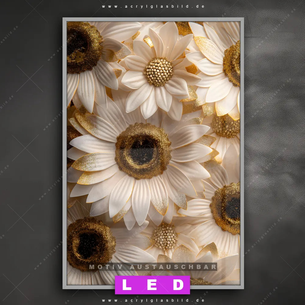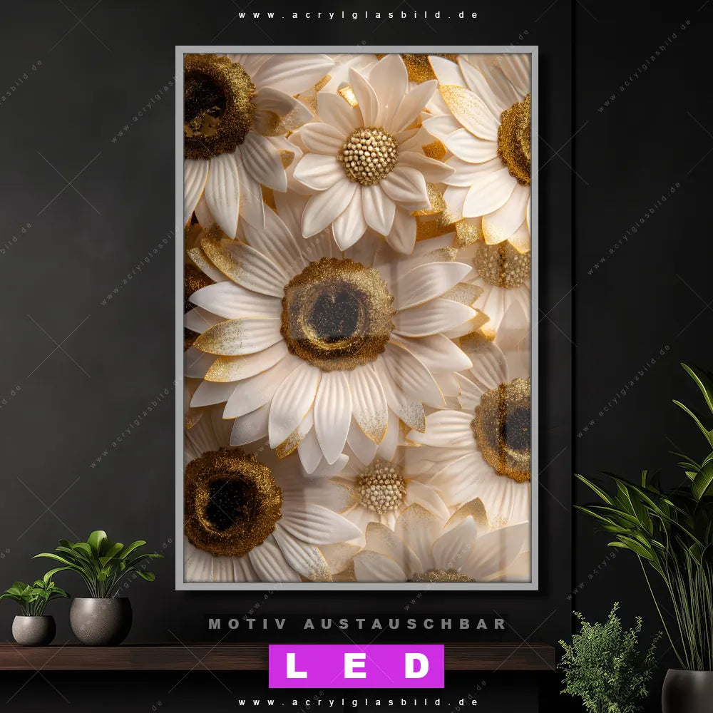 Du suchst nach einem Wandbild mit LED Beleuchtung als ultimativen Hingucker für deine Wände? Dann haben wir das perfekte dimmbare LED Bild mit Fernbedienung und optionaler Farbtemperatursteuerung für dich: unser abgefahrenes Blumen - Botanik Canvalight® DIA LED Acrylglasbild! Mit dem LED Leuchtbild aus Acrylglas Goldene Blütenpracht im Hochformat mit austauschbarer bedruckter Acrylglas-Scheibe bringst du nicht nur Licht, sondern auch ordentlich Stil in deine Bude.