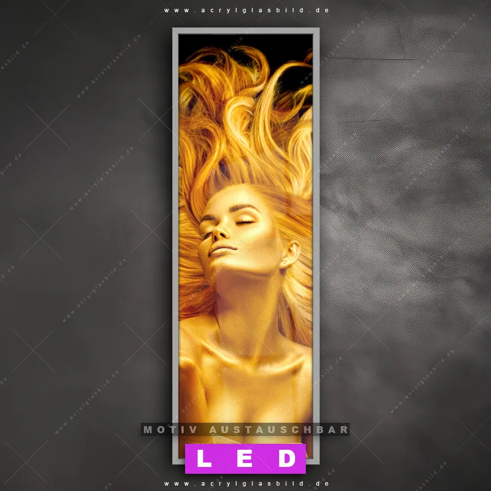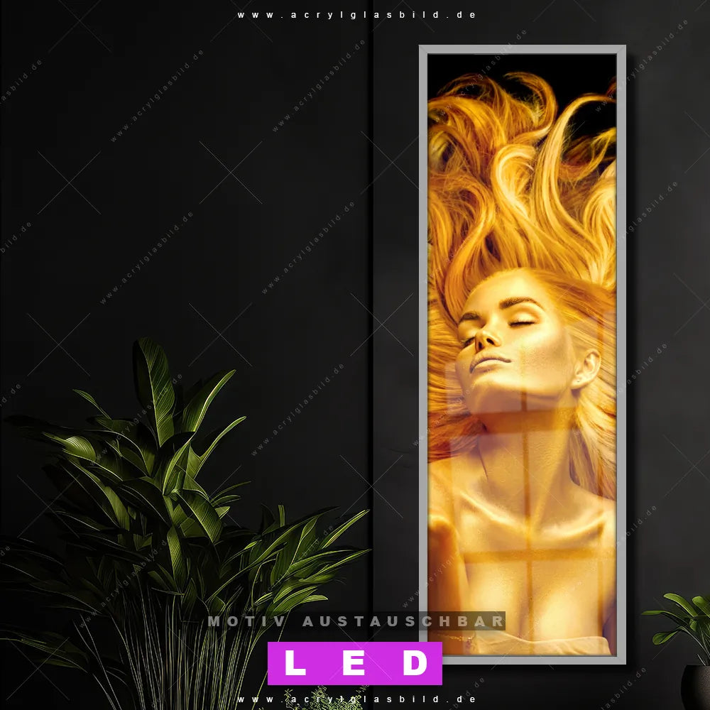 Bist du bereit, deine Wände mit einem dimmbaren LED Bild mit Fernbedienung und optionaler Farbtemperatursteuerung auf das nächste Level zu bringen? Unser Porträts - Menschen Canvalight® DIA LED Acrylglasbild ist genau das, was du brauchst! Das Wandbild mit LED Beleuchtung im Schmalen Format mit austauschbarer bedruckter Acrylglas-Scheibe Goldenes Haar No. 2 bringt Licht und Stil in dein Zuhause – und das in null Komma nichts!