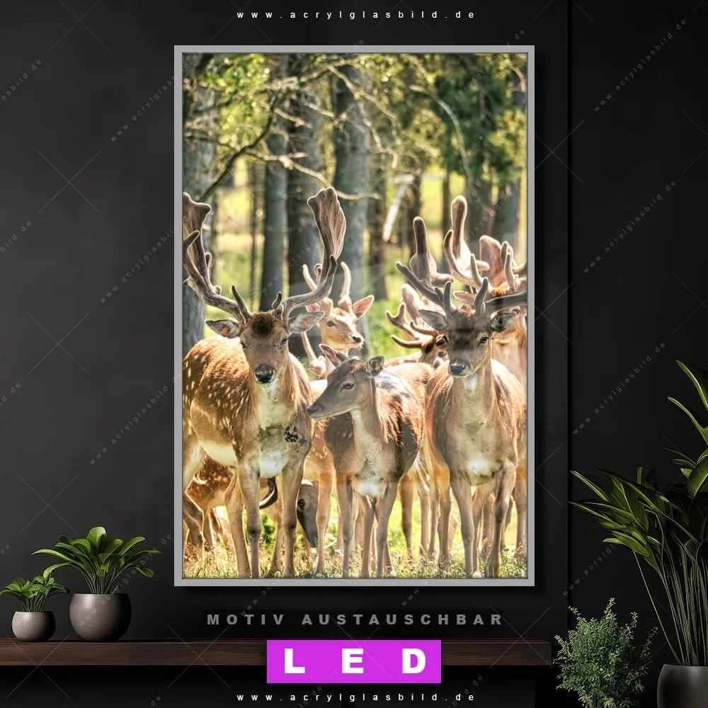 Du suchst nach einem Wandbild mit LED Beleuchtung als ultimativen Hingucker für deine Wände? Dann haben wir das perfekte dimmbare LED Bild mit Fernbedienung und optionaler Farbtemperatursteuerung für dich: unser abgefahrenes Landschaften, Tierwelt Canvalight® DIA LED Acrylglasbild! Mit dem LED Leuchtbild aus Acrylglas Gruppe Rotwild im Hochformat mit austauschbarer bedruckter Acrylglas-Scheibe bringst du nicht nur Licht, sondern auch ordentlich Stil in deine Bude.