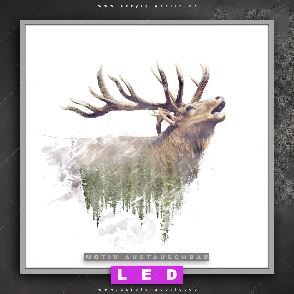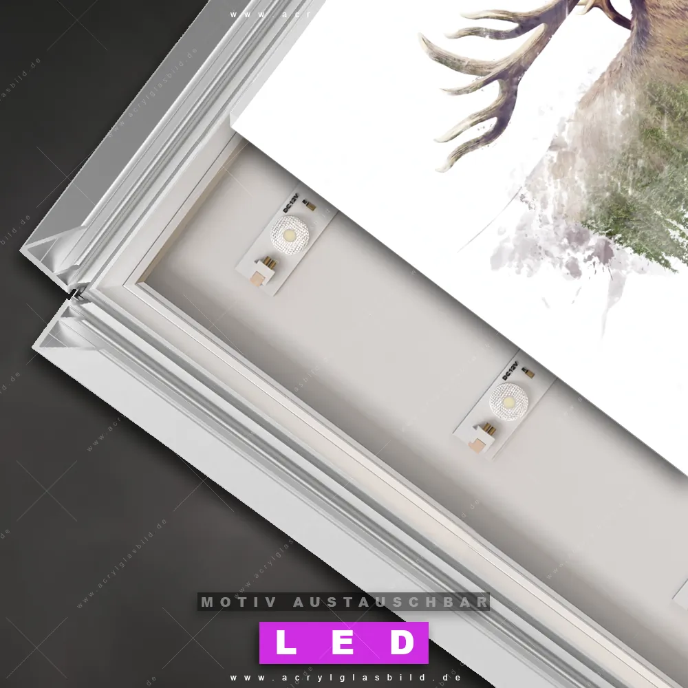 Also, worauf wartest du noch? Gib mit einem beleuchteten Wandbild mit wechselbarer Acrylglas-Scheibe deinen Wänden das gewisse Etwas und bestelle jetzt das LED Acrylglasbild Canvalight® DIA kräftiger Hirschkopf mit Bäumen – dein Zuhause wird es dir danken und deine Freunde werden dank der wechselbaren Motive erblassen!