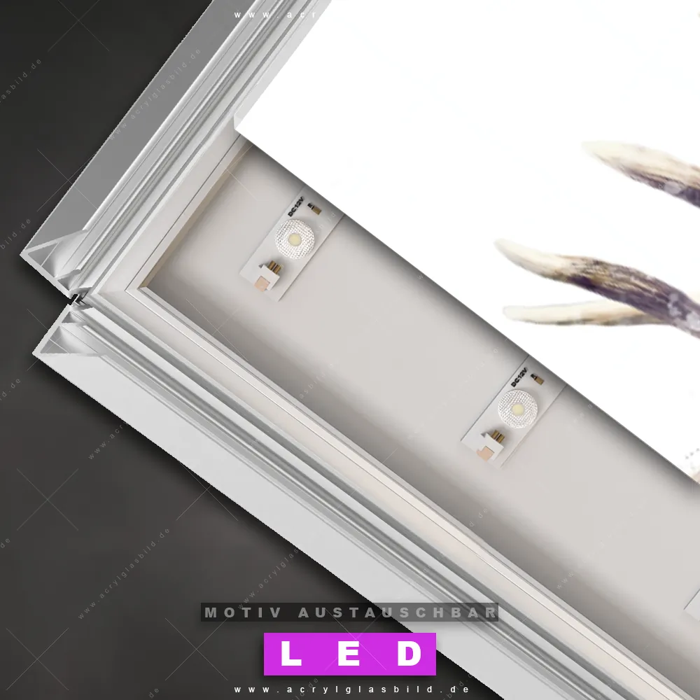Bist du bereit, deine Wände mit einem dimmbaren LED Bild mit Fernbedienung und optionaler Farbtemperatursteuerung auf das nächste Level zu bringen? Unser Tierwelt Canvalight® DIA LED Acrylglasbild ist genau das, was du brauchst! Das Wandbild mit LED Beleuchtung im Schmalen Format mit austauschbarer bedruckter Acrylglas-Scheibe Hirsch & Wald No.2 bringt Licht und Stil in dein Zuhause – und das in null Komma nichts!