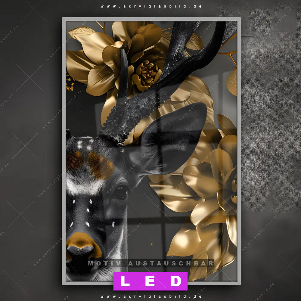 LED Acrylglasbild Canvalight® DIA | Junger Hirsch und Goldblumen | Hochformat