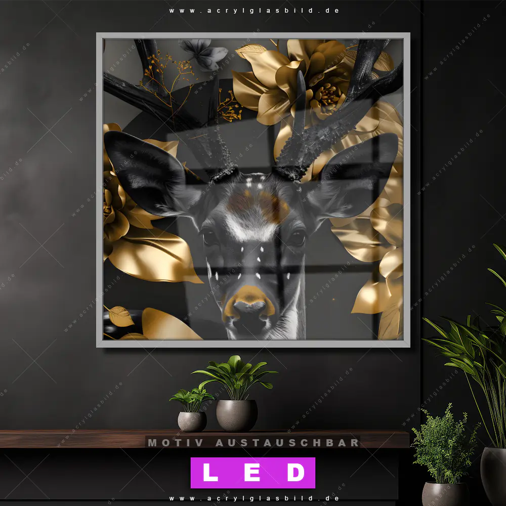 Bist du bereit, deine Wände mit einem dimmbaren LED Bild mit Fernbedienung und optionaler Farbtemperatursteuerung zum Leuchten zu bringen? Wir haben das ultimative Tierwelt, Blumen - Botanik LED Acrylglasbild Canvalight® DIA für dich! Unser LED Wandbild aus Acrylglas Junger Hirsch und Goldblumen im Quadratischen Format mit austauschbarer bedruckter Acrylglas-Scheibe im DIA-Klapprahmen bringt sofort jede Menge Glanz in deine vier Wände.
