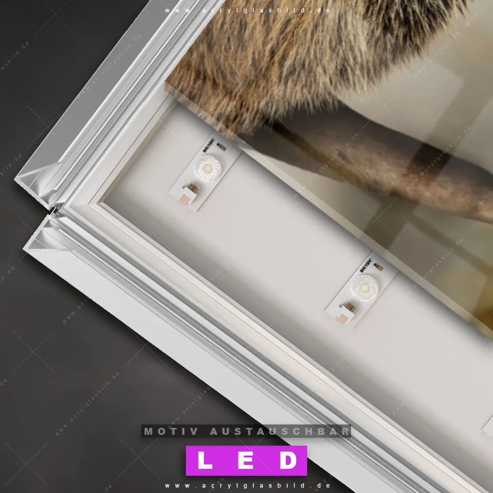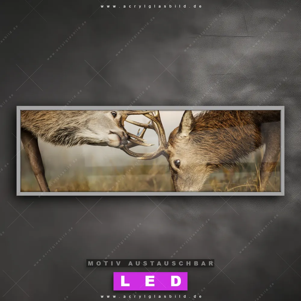 Deine Wände könnten dringend ein dimmbares LED Bild mit Fernbedienung und optionaler Farbtemperatursteuerung gebrauchen? Dann haben wir das perfekte Wandbild mit LED Beleuchtung für dich: unser mega-cooles Tierwelt Canvalight® DIA LED Acrylglasbild! Mit unserem angesagten Leuchtbild aus Acrylglas im Panorama-Format und der austauschbaren bedruckten Acrylglas-Scheibe Kämpfende Hirsche bringst du nicht nur Licht, sondern auch jede Menge Flair in deine Räume.