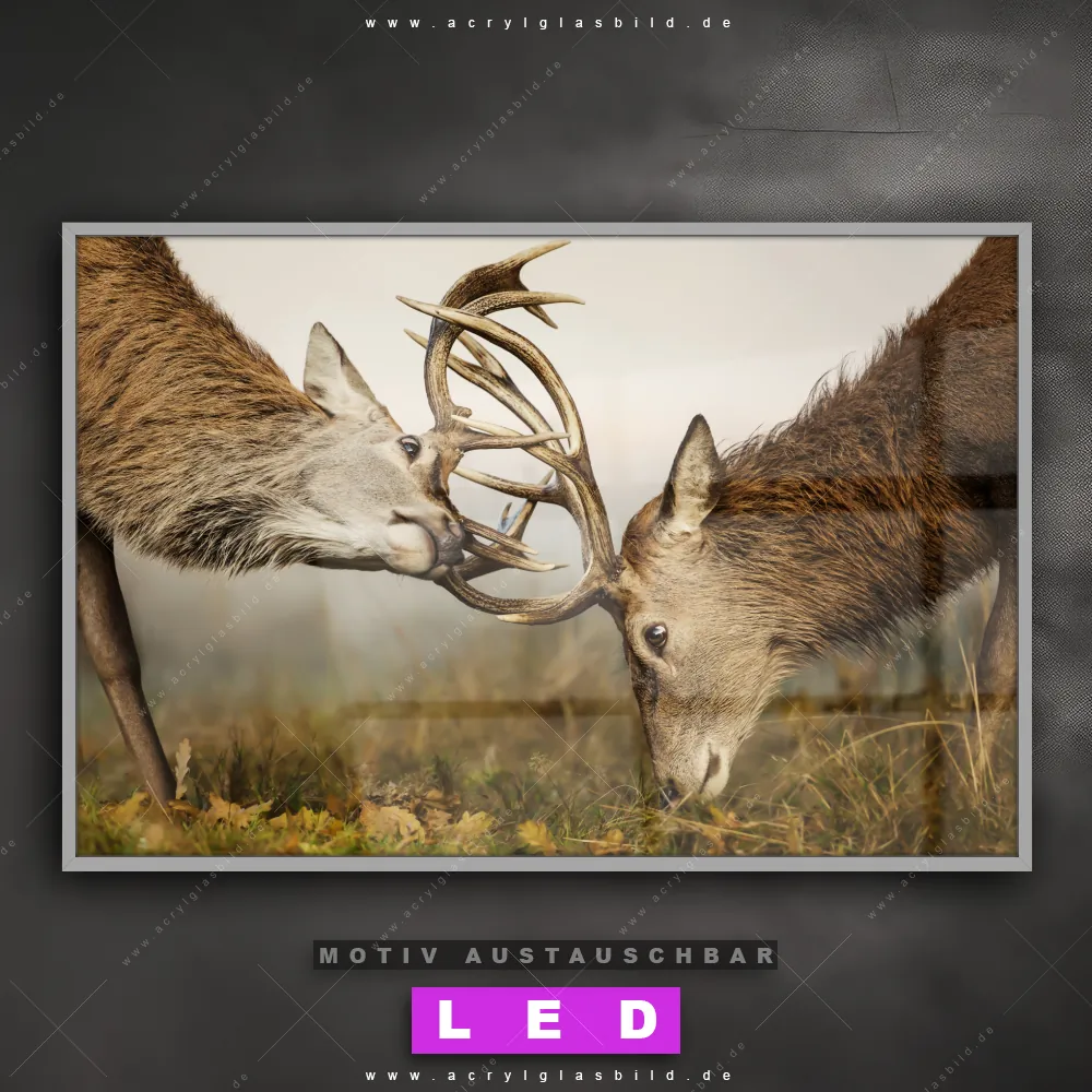 Du bist auf der Suche nach einem dimmbaren Tierwelt LED Bild mit Fernbedienung und optionaler Farbtemperatursteuerung? Dann haben wir hier genau das richtige Wandbild mit LED Beleuchtung für dich: Unser Canvalight® DIA LED Acrylglasbild Kämpfende Hirsche im Querformat mit austauschbarer bedruckter Acrylglas-Scheibe. Dieses Leuchtbild bringt sofort Partybeleuchtung in deine Räume!