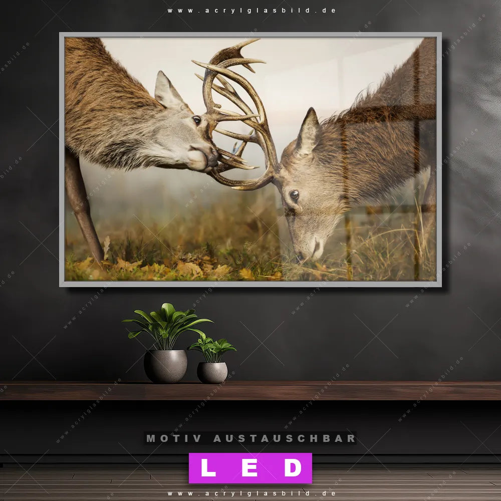 Mit unserem LED Acrylglasbild Canvalight® DIA Hirschkampft und seiner genialen LED-Ausleuchtung wirst du nie wieder im Dunkeln auf deinem Sofa herumtappen. Wenn du nach einem beleuchteten Wandbild aus Acrylglas mit Hirsch, Deer, skandinavisch, Rotwild, Reh, Dammwild, Geweih, Kampf für Arzt - Praxis, Bar - Gastronomie, Büro - Kanzlei, Wohnzimmer - Schlafzimmer suchst, ist unser LED Leuchtbild Kampf der Geweihe in den beeindruckenden Motiv-Farben Braun, Beige genau das richtige beleuchtete Wandbild für dich. Gestaltet im Natürlich - Realistisch Stil, passt dieses LED Wandbild mit DIA-Klapprahmen und glänzender Front aus Acrylglas perfekt zu jedem Einrichtungsstil – sogar zu deinem chaotischen kreativen Durcheinander!