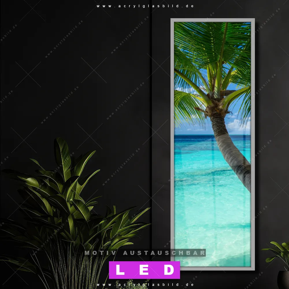 Bist du bereit, deine Wände mit einem dimmbaren LED Bild mit Fernbedienung und optionaler Farbtemperatursteuerung auf das nächste Level zu bringen? Unser Landschaften, Strand - Meer Canvalight® DIA LED Acrylglasbild ist genau das, was du brauchst! Das Wandbild mit LED Beleuchtung im Schmalen Format mit austauschbarer bedruckter Acrylglas-Scheibe Kokospalme am Strand bringt Licht und Stil in dein Zuhause – und das in null Komma nichts!