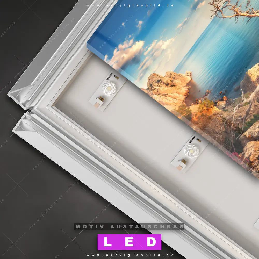 Also, worauf wartest du noch? Gib mit einem beleuchteten Wandbild mit wechselbarer Acrylglas-Scheibe deinen Wänden das gewisse Etwas und bestelle jetzt das LED Acrylglasbild Canvalight® DIA Felsen und Meer – dein Zuhause wird es dir danken und deine Freunde werden dank der wechselbaren Motive erblassen!