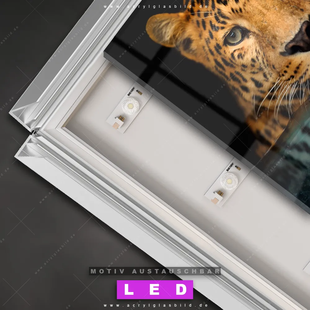 Also, worauf wartest du noch? Gib mit einem beleuchteten Wandbild mit wechselbarer Acrylglas-Scheibe deinen Wänden das gewisse Etwas und bestelle jetzt das LED Acrylglasbild Canvalight® DIA Achtsamer Leopard – dein Zuhause wird es dir danken und deine Freunde werden dank der wechselbaren Motive erblassen!