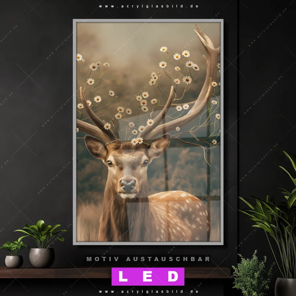 Wer braucht schon langweilige Wände, wenn man sie mit unserem LED Acrylglasbild Canvalight® DIA Rotwild mit blumengeschmücktem Geweih aufpeppen kann? Dank der genialen LED-Ausleuchtung wirst du in Flur - Eingangsbereich, Wohnzimmer - Schlafzimmer, Arzt - Praxis nie wieder über deine eigenen Füße stolpern. Wenn du nach einem beleuchteten Wandbild aus Acrylglas mit Hirsch, Gänseblümchen, Rotwild, Wald, Blüten, Geweih, Blumen, Rothirsch suchst, dann ist unser LED Acrylglasbild Blumengekrönter Hirsch in den hammermäßigen Motiv-Farben Beige, Braun, Weiss genau das richtige LED Bild für dich. Im coolen Floral, Retro - Vintage, Surreal - Fantasy Stil gestaltet, passt das LED Leuchtbild mit DIA-Klapprahmen und glänzender Front aus Acrylglas perfekt zu jedem Einrichtungsstil – sogar zu deinem chaotischen Kreativlabor!