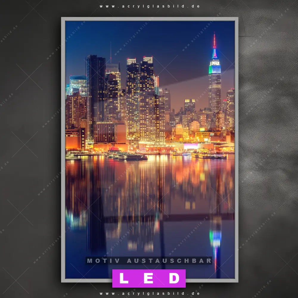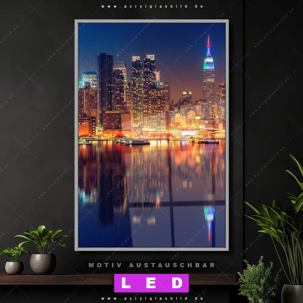 Du suchst nach einem Wandbild mit LED Beleuchtung als ultimativen Hingucker für deine Wände? Dann haben wir das perfekte dimmbare LED Bild mit Fernbedienung und optionaler Farbtemperatursteuerung für dich: unser abgefahrenes Städte - Skylines Canvalight® DIA LED Acrylglasbild! Mit dem LED Leuchtbild aus Acrylglas Manhattan bei Nacht im Hochformat mit austauschbarer bedruckter Acrylglas-Scheibe bringst du nicht nur Licht, sondern auch ordentlich Stil in deine Bude.