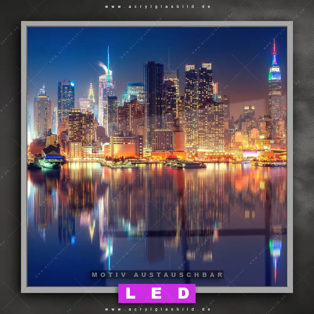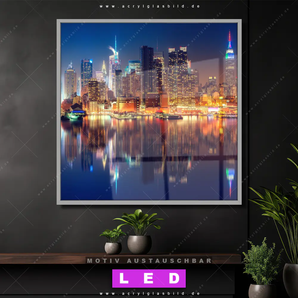 Bist du bereit, deine Wände mit einem dimmbaren LED Bild mit Fernbedienung und optionaler Farbtemperatursteuerung zum Leuchten zu bringen? Wir haben das ultimative Städte - Skylines LED Acrylglasbild Canvalight® DIA für dich! Unser LED Wandbild aus Acrylglas Manhattan bei Nacht im Quadratischen Format mit austauschbarer bedruckter Acrylglas-Scheibe im DIA-Klapprahmen bringt sofort jede Menge Glanz in deine vier Wände.