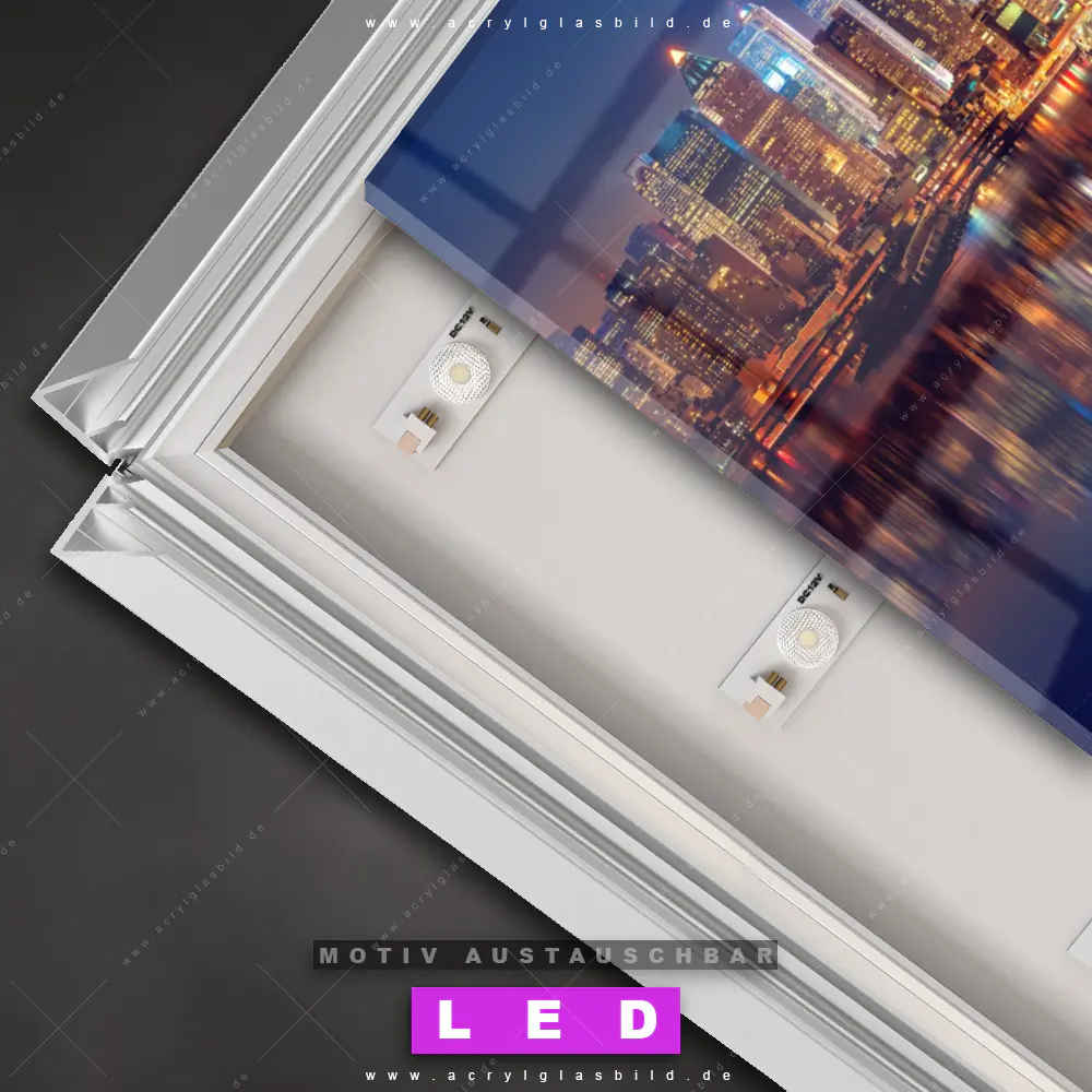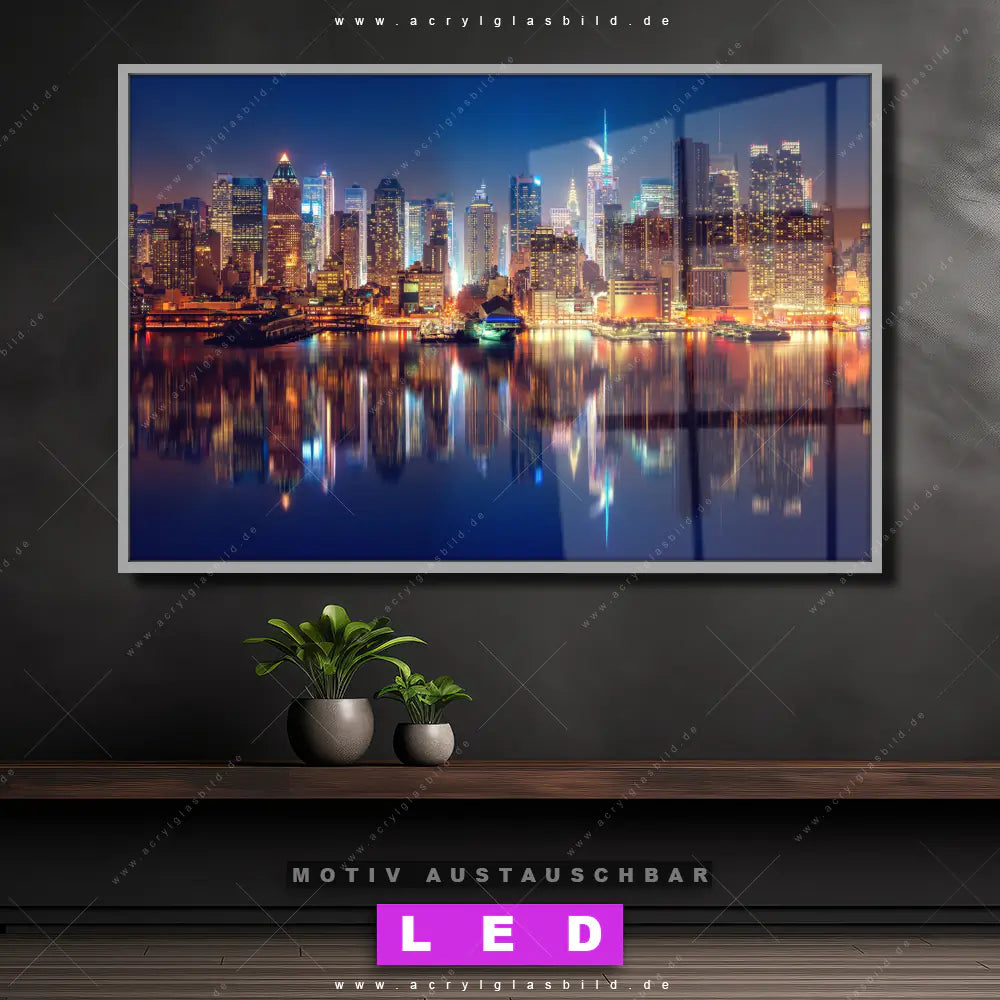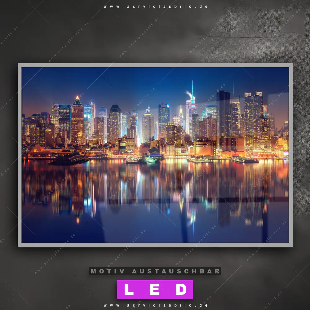 Du bist auf der Suche nach einem dimmbaren Städte - Skylines LED Bild mit Fernbedienung und optionaler Farbtemperatursteuerung? Dann haben wir hier genau das richtige Wandbild mit LED Beleuchtung für dich: Unser Canvalight® DIA LED Acrylglasbild Manhattan bei Nacht im Querformat mit austauschbarer bedruckter Acrylglas-Scheibe. Dieses Leuchtbild bringt sofort Partybeleuchtung in deine Räume!