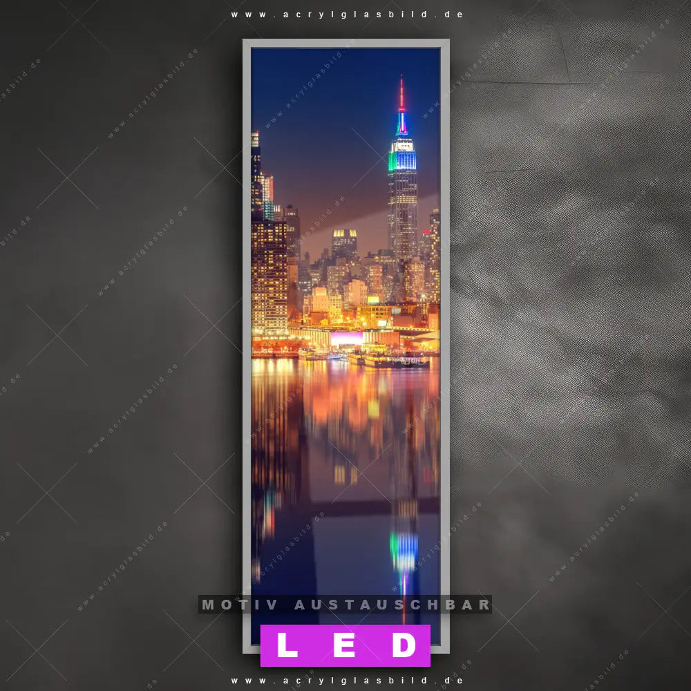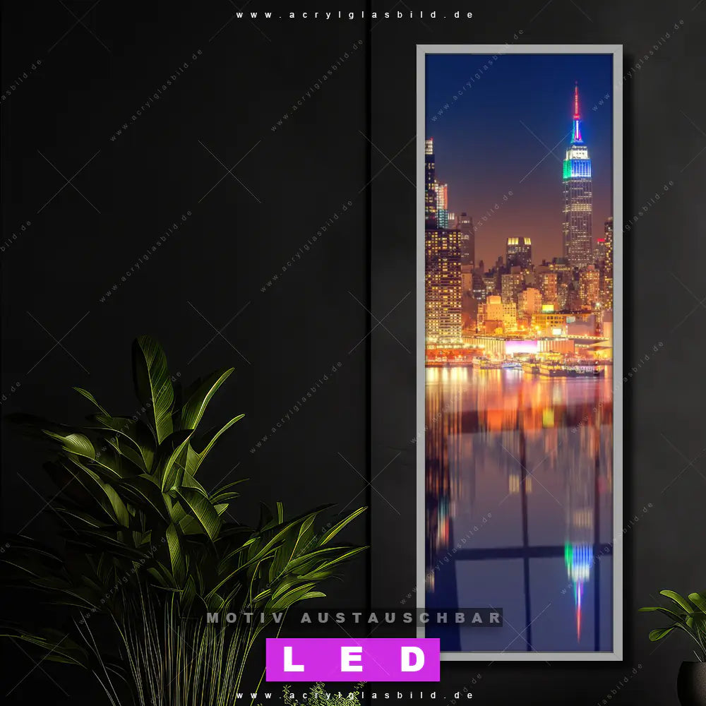 Bist du bereit, deine Wände mit einem dimmbaren LED Bild mit Fernbedienung und optionaler Farbtemperatursteuerung auf das nächste Level zu bringen? Unser Städte - Skylines Canvalight® DIA LED Acrylglasbild ist genau das, was du brauchst! Das Wandbild mit LED Beleuchtung im Schmalen Format mit austauschbarer bedruckter Acrylglas-Scheibe Manhattan bei Nacht bringt Licht und Stil in dein Zuhause – und das in null Komma nichts!