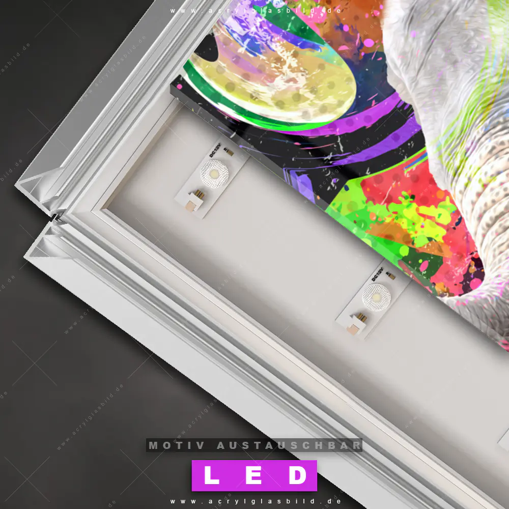 Wer braucht schon langweilige Wände, wenn man sie mit unserem LED Acrylglasbild Canvalight® DIA Bunter Elefant aufpeppen kann? Dank der genialen LED-Ausleuchtung wirst du in Wohnzimmer - Schlafzimmer, Bar - Gastronomie, Flur - Eingangsbereich, Kinderzimmer nie wieder über deine eigenen Füße stolpern. Wenn du nach einem beleuchteten Wandbild aus Acrylglas mit Elefant, Afrika, Big Five, Dickhäuter, Stoßzahn, Farbspritzer, Farbwolke, Dschungel suchst, dann ist unser LED Acrylglasbild Elefant Street Art in den hammermäßigen Motiv-Farben Bunt genau das richtige LED Bild für dich. Im coolen Modern Art, Pop Art Stil gestaltet, passt das LED Leuchtbild mit DIA-Klapprahmen und glänzender Front aus Acrylglas perfekt zu jedem Einrichtungsstil – sogar zu deinem chaotischen Kreativlabor!