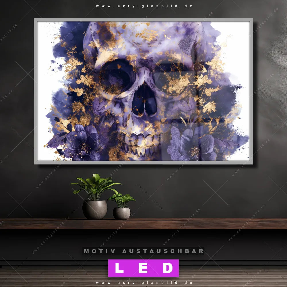 Mit unserem LED Acrylglasbild Canvalight® DIA Totenkopf in Gold und Lila und seiner genialen LED-Ausleuchtung wirst du nie wieder im Dunkeln auf deinem Sofa herumtappen. Wenn du nach einem beleuchteten Wandbild aus Acrylglas mit Schädel, Totenkopf, Skelett, Knochen, Blumen, Blüten für Bar - Gastronomie, Wohnzimmer - Schlafzimmer, Flur - Eingangsbereich suchst, ist unser LED Leuchtbild Totenschädel mit Blumen in den beeindruckenden Motiv-Farben Weiss, Gold, Lila genau das richtige beleuchtete Wandbild für dich. Gestaltet im Modern Art, Floral Stil, passt dieses LED Wandbild mit DIA-Klapprahmen und glänzender Front aus Acrylglas perfekt zu jedem Einrichtungsstil – sogar zu deinem chaotischen kreativen Durcheinander!
