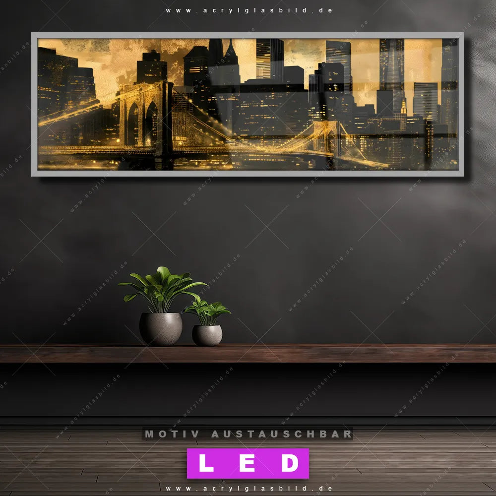 Wer will schon dunkle, triste Wände? Mit unserem LED Acrylglasbild Canvalight® DIA Leuchtende Stadt der Träume und seiner fantastischen LED-Ausleuchtung werden deine Wände in Bar - Gastronomie, Büro - Kanzlei, Flur - Eingangsbereich zu echten Hinguckern. Wenn du auf der Suche nach einem beleuchteten Wandbild aus Acrylglas mit Skyline, Metropole, Häuser, Wolkenkratzer, Hochhäuser, Stadt, Gebäude, Malerei, Brücke bist, dann solltest du unser LED Leuchhtbild Glanzvolle Skyline im Nebel mit den beeindruckenden Motiv-Farben Schwarz, Gold nicht verpassen. Gestaltet im angesagten Modern Art, Abstrakt Stil, passt das LED Bild mit DIA-Klapprahmen und wechselbarer Acrylglas-Scheibe perfekt zu jedem Einrichtungsstil – selbst in deinem kleinen Dschungel aus Kreativität und Chaos!